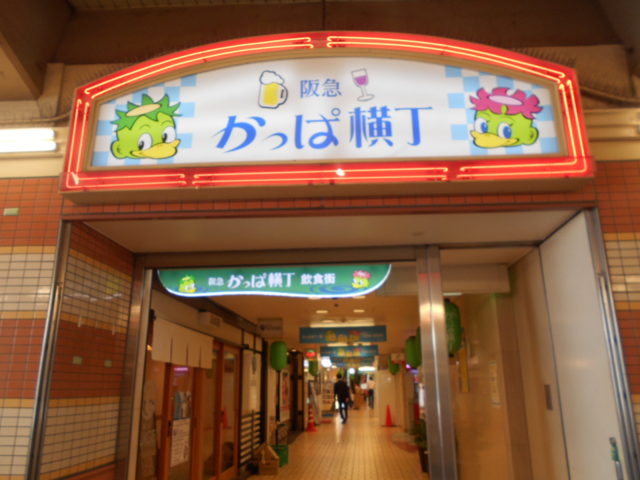 かっぱのキャラクターがなんとなく昔から気に入っています。阪急梅田駅の茶屋町の高架下にあります。飲食店が集まっています。昔ながらの雰囲気です。古書店はきれいに変わりました。ここもいずれ変わるのかな。かっぱのキャラクターはなくならないでほしいなと思います。