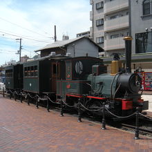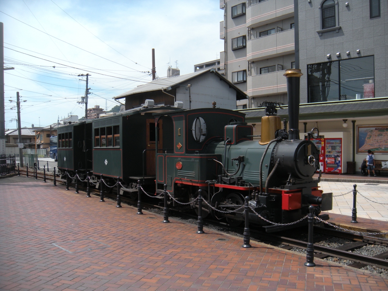 SL型のディゼル機関車がマッチ箱の小さな客車をけん引して伊予鉄道の路面電車の線路を走る観光列車です。