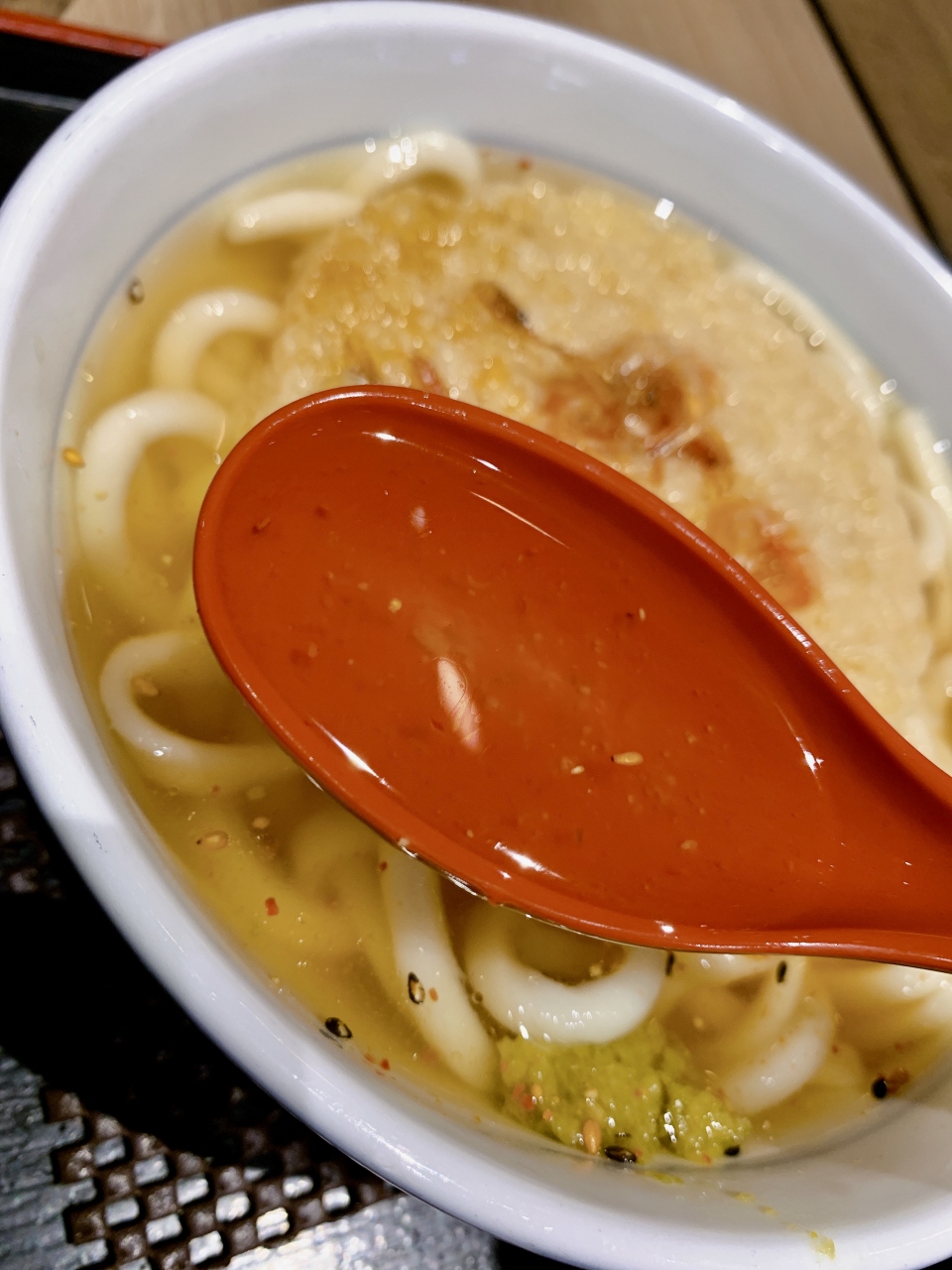先ずはスープから~昆布のお出汁が効いて美味しい!薄いように感じるがこのくらいが丁度良い。このエビ天はかき揚げのようになっていてるので「天ぷらの衣」がうどんスープに溶け込んでくる。この「天かす」とうどんが良く合う!博多庶民はこのシンプルな味がとても好きなんだな~