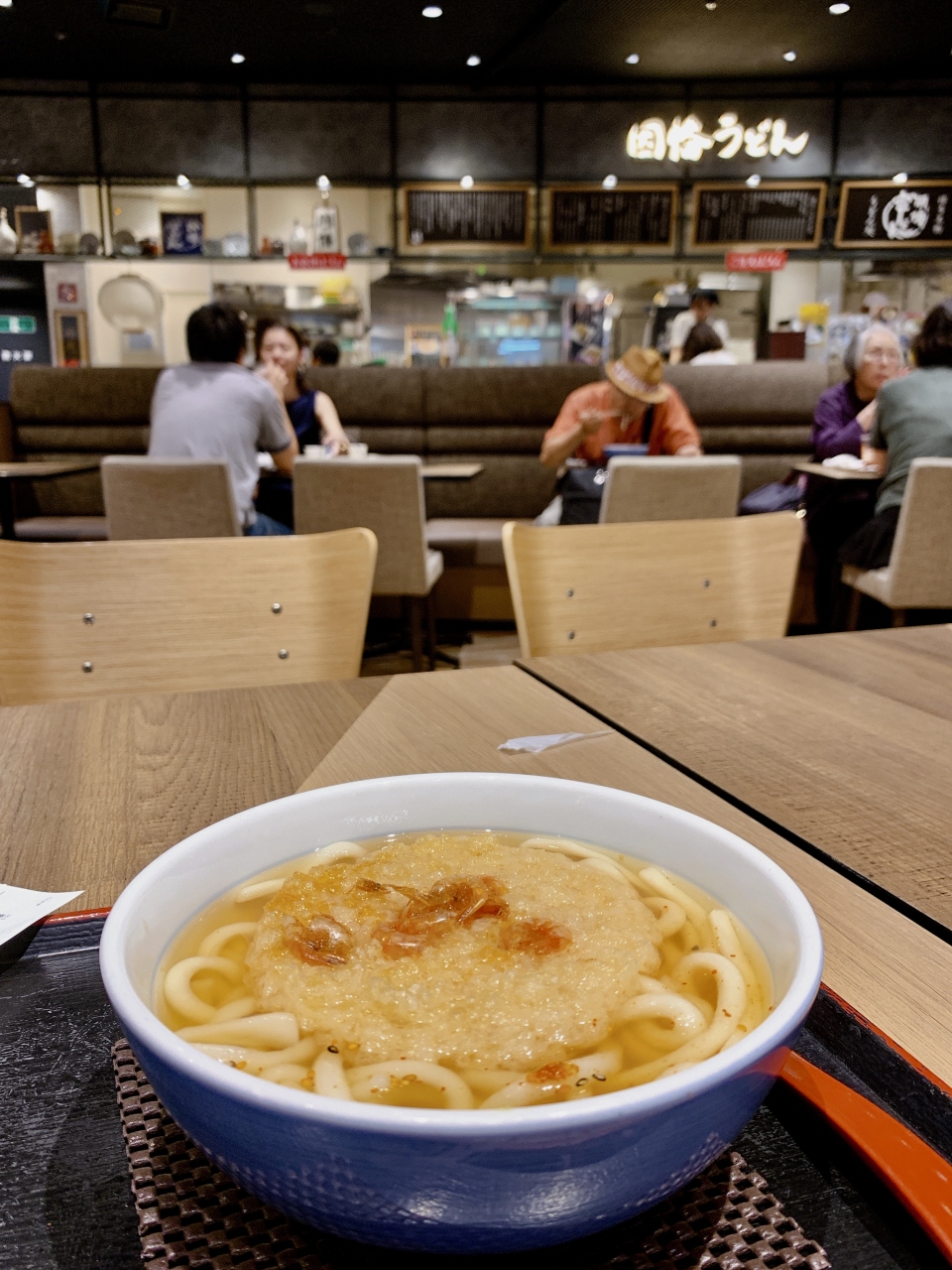 コチラの店舗は注文してお金を支払い自分でトレーにて座席に持っていくフードコートです。ちょうど8時に開店するタイミングに来れたことはラッキー!うどん屋は朝一番に限りますね。
