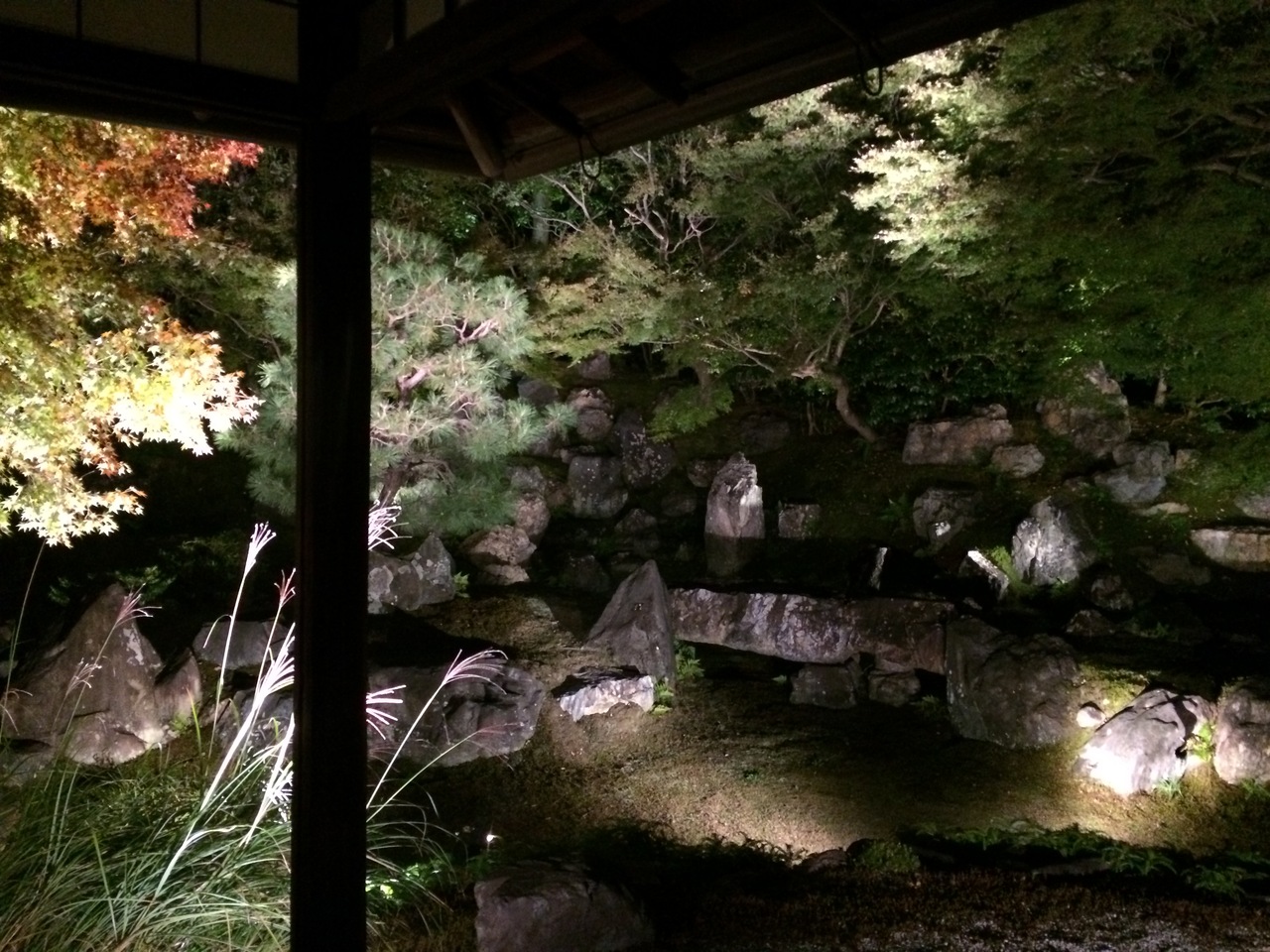紅葉の時期が一番美しいといわれています。というのは、色づきだした緑と石が並んだ枯山水式庭園は、ひっそりたたずみ、日本の静観を表していました。中国の寺院や西欧の教会と違って華やかさはありませんが、室内の屏風の彩りも日本独特の静かな美しさがありました。