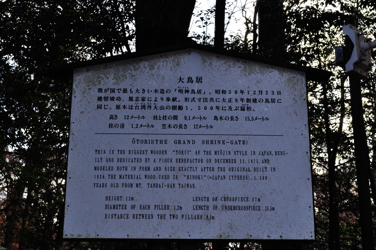 明治神宮大鳥居は明治神宮の境内、明治神宮参集殿の目の前にある大きな木造の鳥居になります。神宮橋を渡ってすぐ南参道の入り口にある鳥居(これは一の鳥居)ではありませんのでご注意ください。こちらの木造の鳥居は檜で作られており、その檜は台湾の阿里山という山から持ってこられたものだそうで、現在の大鳥居は2代目になるそうです。わざわざ台湾からこのような立派な檜を運んできたとは胸が熱くなりますね。