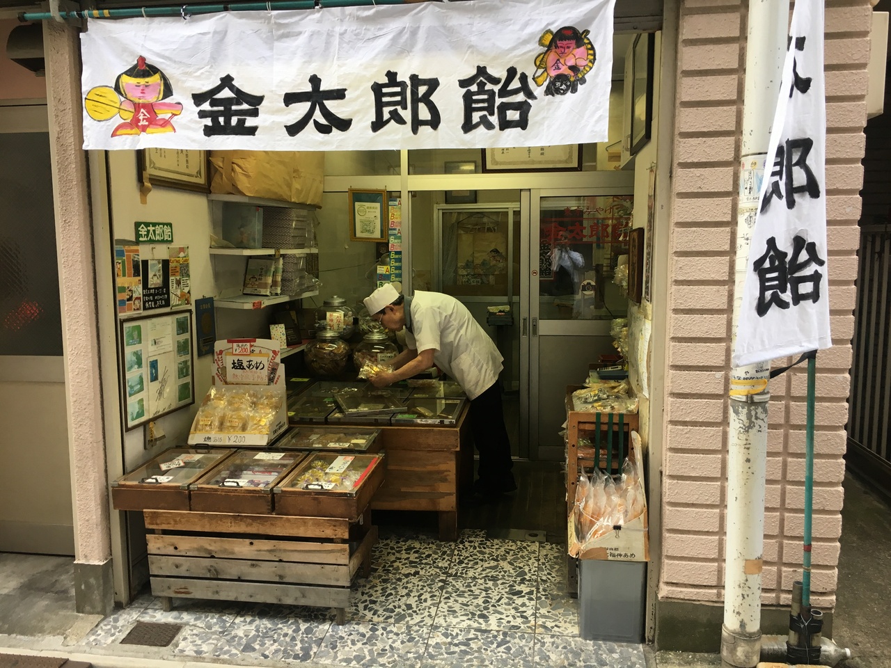 日帰り出張の空き時間、根津神社を参拝した帰り道偶然通りかかりました。古い木枠のガラスケースに入った昔ながらの飴たちに目を惹かれ金太郎飴を買って帰りました。