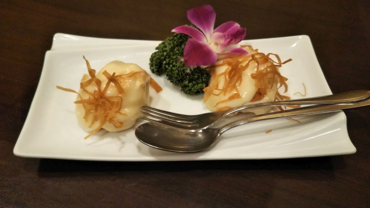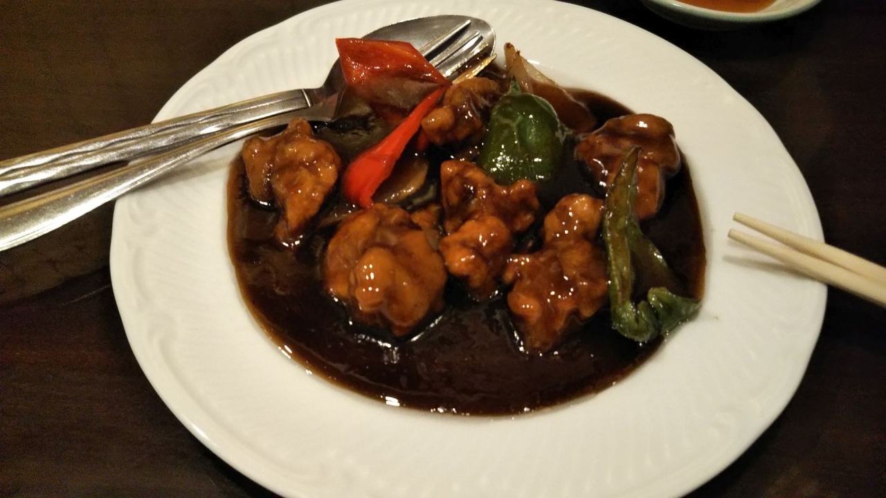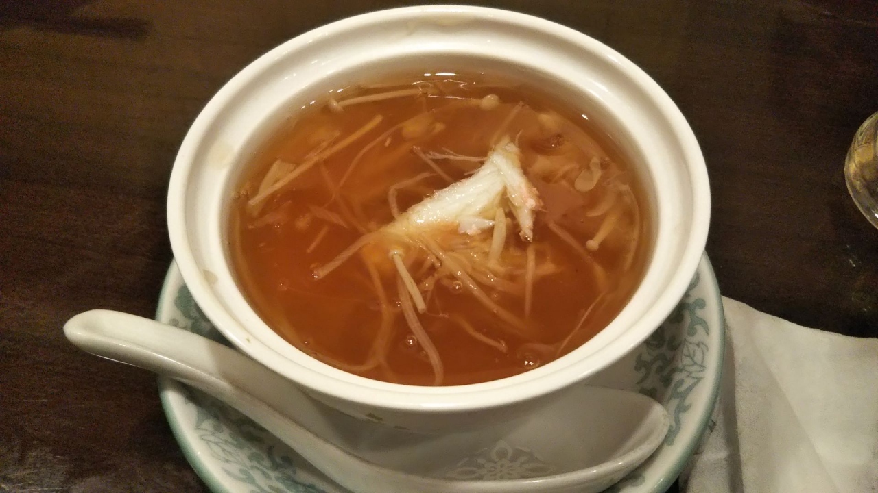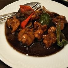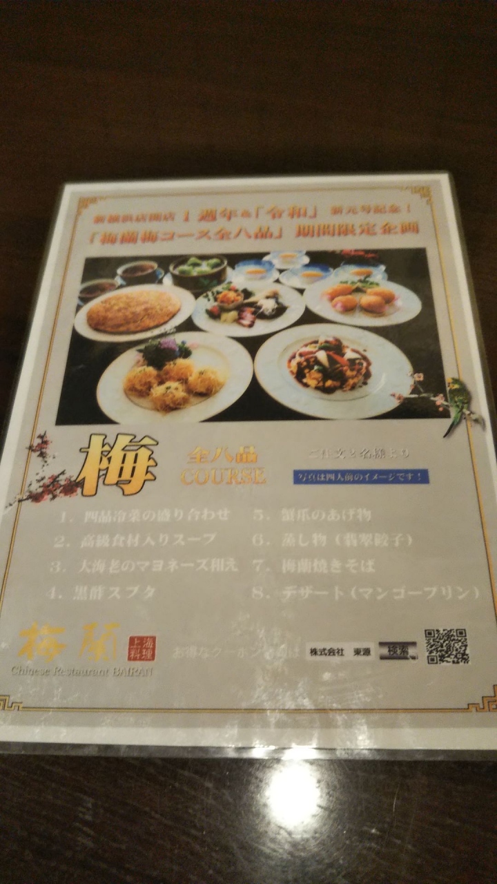 冷菜盛り合わせ、高級食材入りスープ、大海老のマヨネーズ和え、特製黒酢豚、蟹爪肉の揚げ物、翡翠海老蒸し餃子、梅蘭焼きそば、マンゴープリンの8品からのコースでした。
