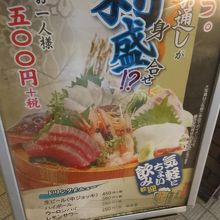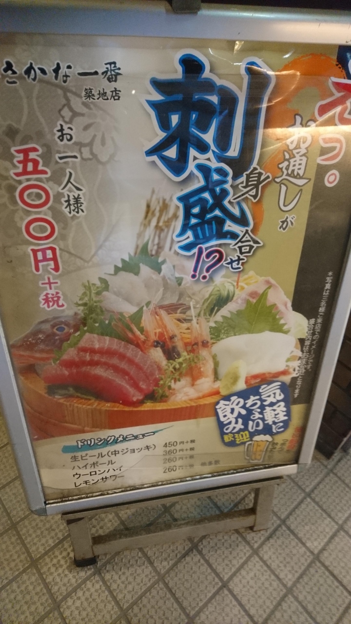 ホテルに近かったので寄りました。刺身が500円という看板にひかれたのです。中を活気があって、店員さんの対応も良く、食べ物もおいしかったです。しかし、この店にたどり着くまでがたいへん。地下にあるのですが、わずか10数段の階段が激暑です。「ここの店に入って大丈夫か?」と思いますが、お店の中は冷房が効いているので勇気を出して入りましょうね。おいしいお刺身が待っています。