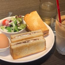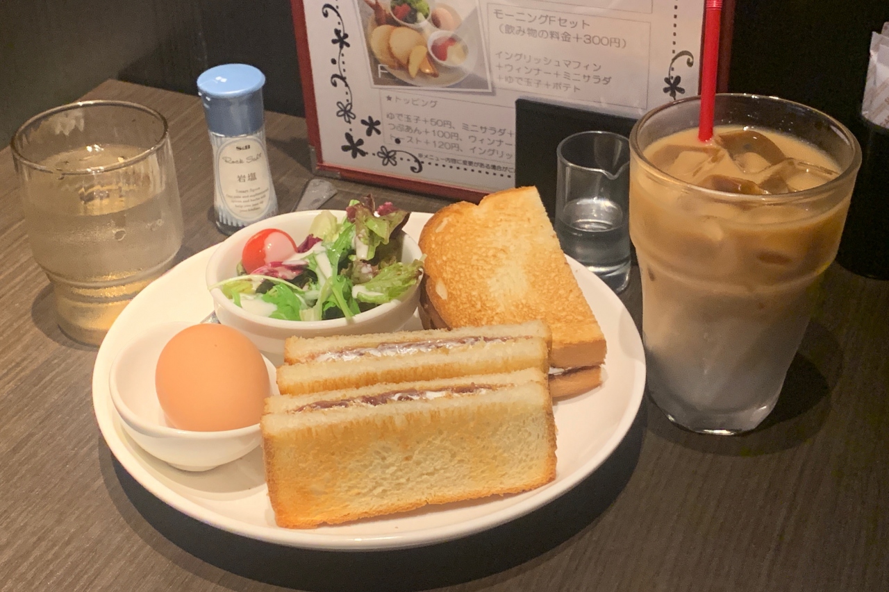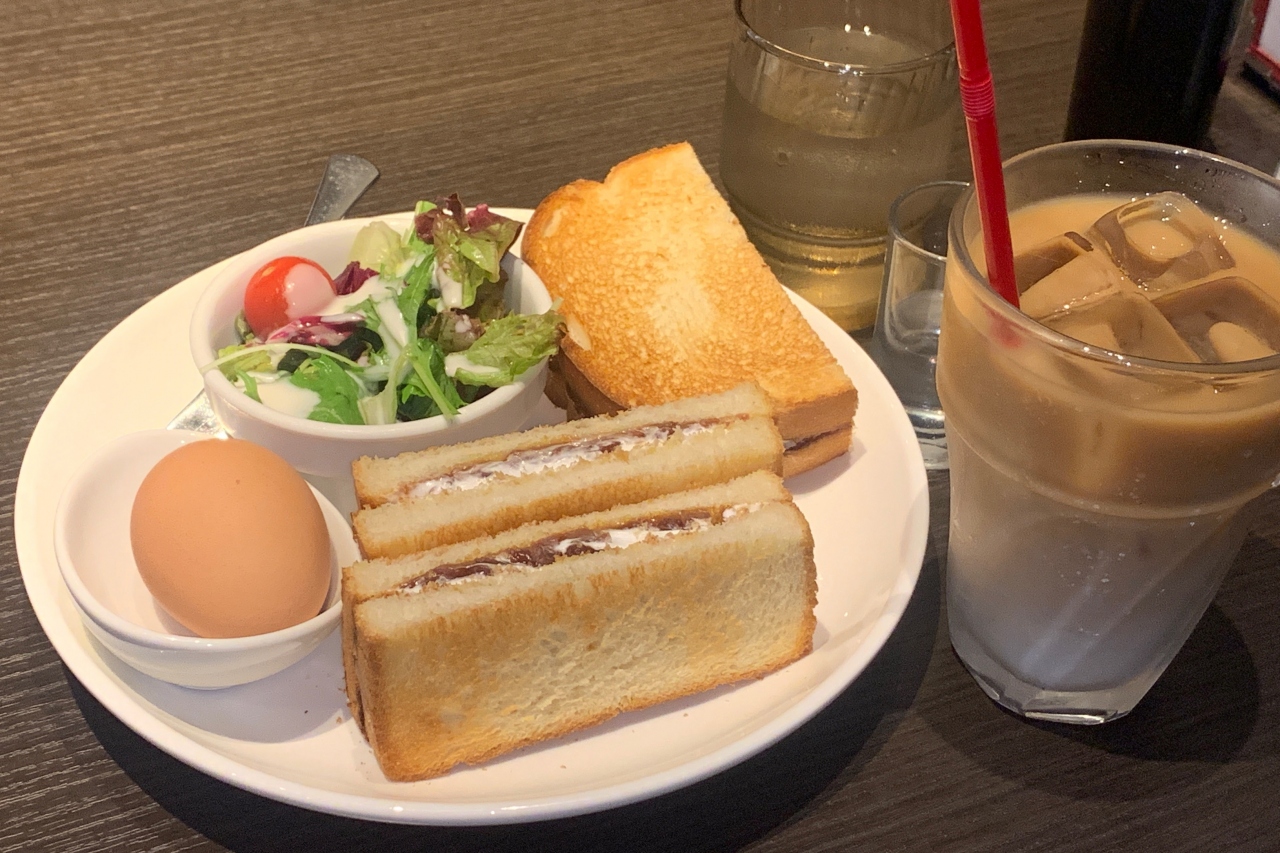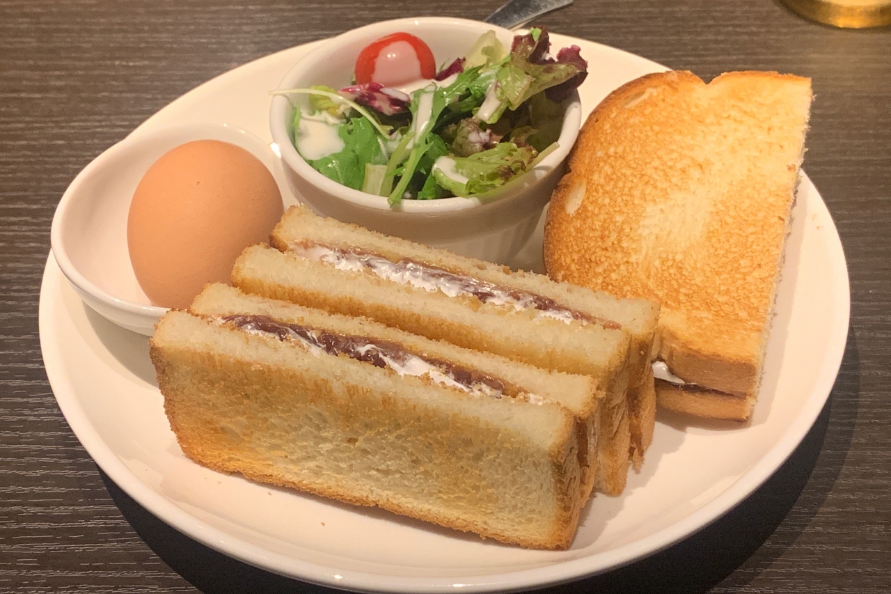 私は、あんこサンド+ミニサラダのモーニングCセット(ドリンク+250円)プラスゆで玉子(+50円)を頂きました。