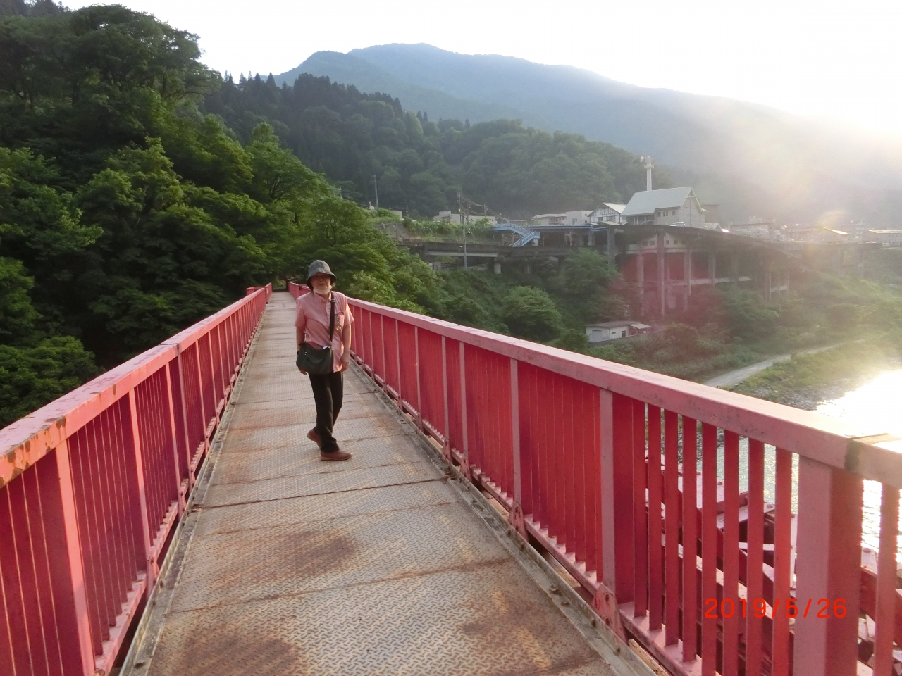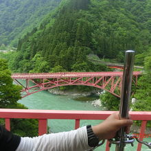 新山彦橋を渡るトロッコ列車から山彦橋を見た。