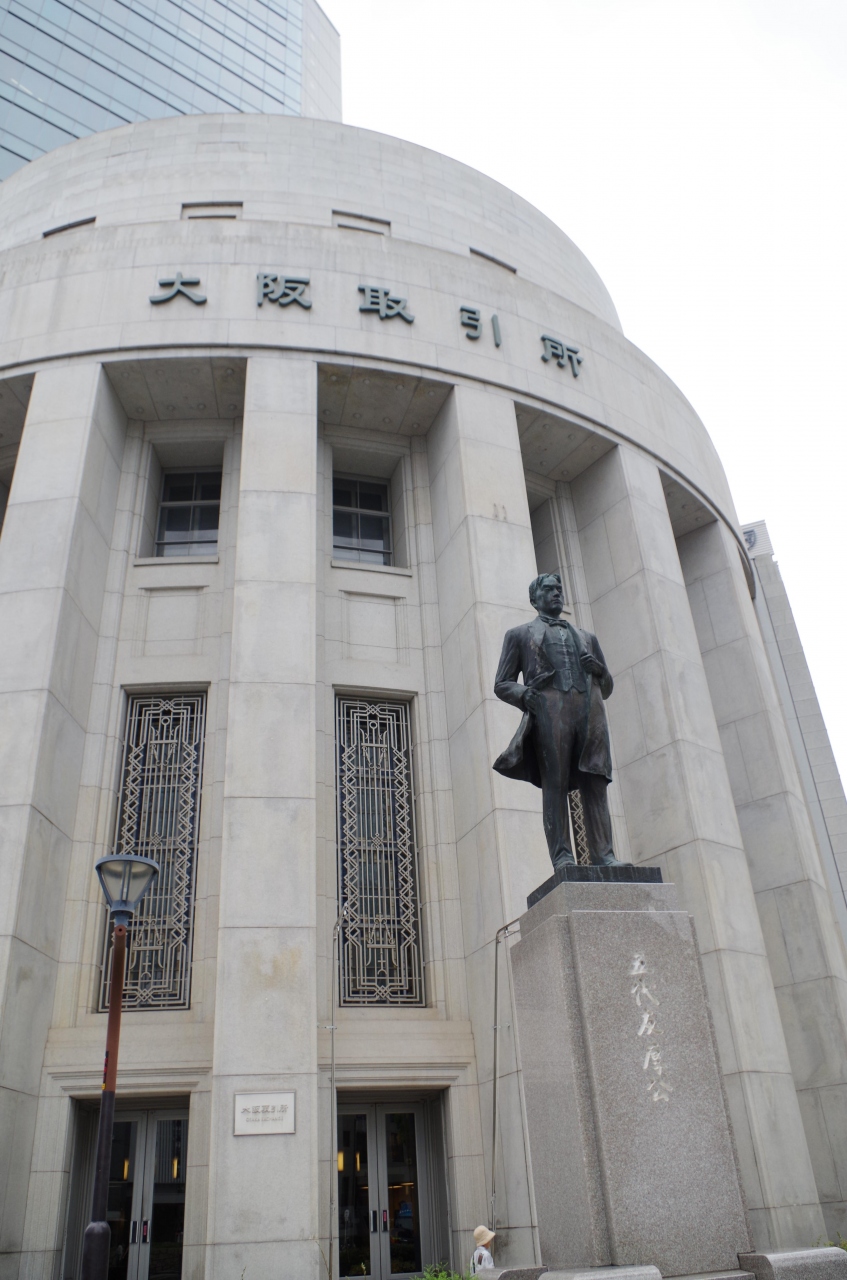 中之島を歩いているときに、難波橋から大通りを見ると、素敵な建物と銅像があったので、近づいてみました。大阪取引所と明記された建てものと五代友厚の銅像でした。土曜日でしたので、クローズしていたみたいです。