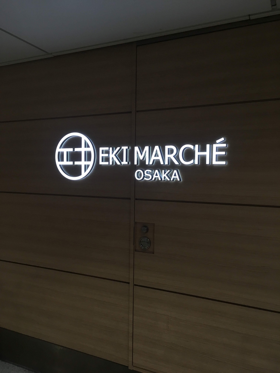 大阪駅改札口付近にある駅ナカショップのエキマルシェ大阪。いろいろなお店がありますが、観光客に使いやすいのが、ドン・キホーテの小型ショップのエキドンキ。大阪みやげのお菓子からネクタイ、化粧品、モバイルバッテリーまでなんでも売っていて朝から営業しています。ここ以外のお店が朝10時から営業しています。