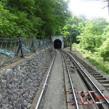 ケーブルの線路、到着先の美女平駅、対向車のケーブルカーが見ものです。
