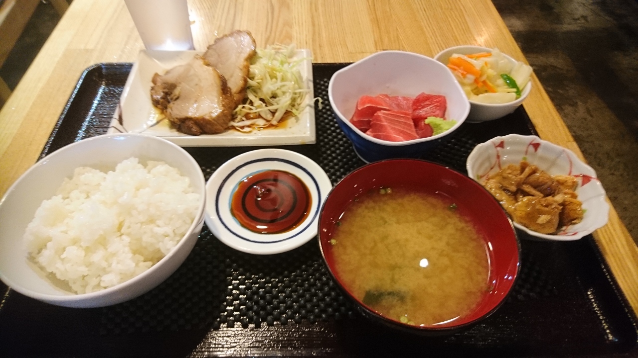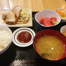 宿泊したホテルの朝食がここでした。最初は、ホテルから少し離れているので、ホテルの1階のカフェにしようかと思いましたが、せっかく築地に来たのに市場飯しを食べないでどうすると思い行きました。やっぱり正解。マグロの刺身と分厚いチャーシューのセットでした。しかも、嬉しいことに、漬物と小鉢が食べ放題。チャ-シューと漬物の相性が最高でした。マグロもおいしく、朝から良いスタートがきれました。