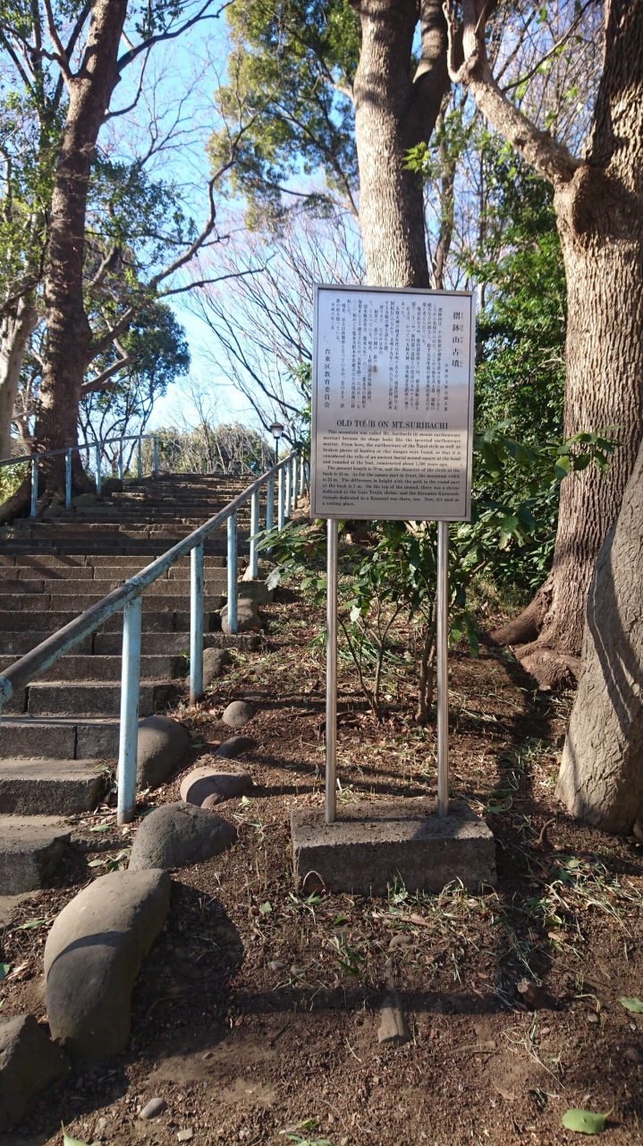 上野公園内を散策しているときに高台の休憩所を見つけ、説明版には擂鉢山古墳と書かれていました。確かに擂鉢を伏せたような形の丘でしたが、こんなところに古墳があるとは驚きでした。階段を上っていかないと上の様子が見えないので、ちょっとした隠れ家のような感じでした。