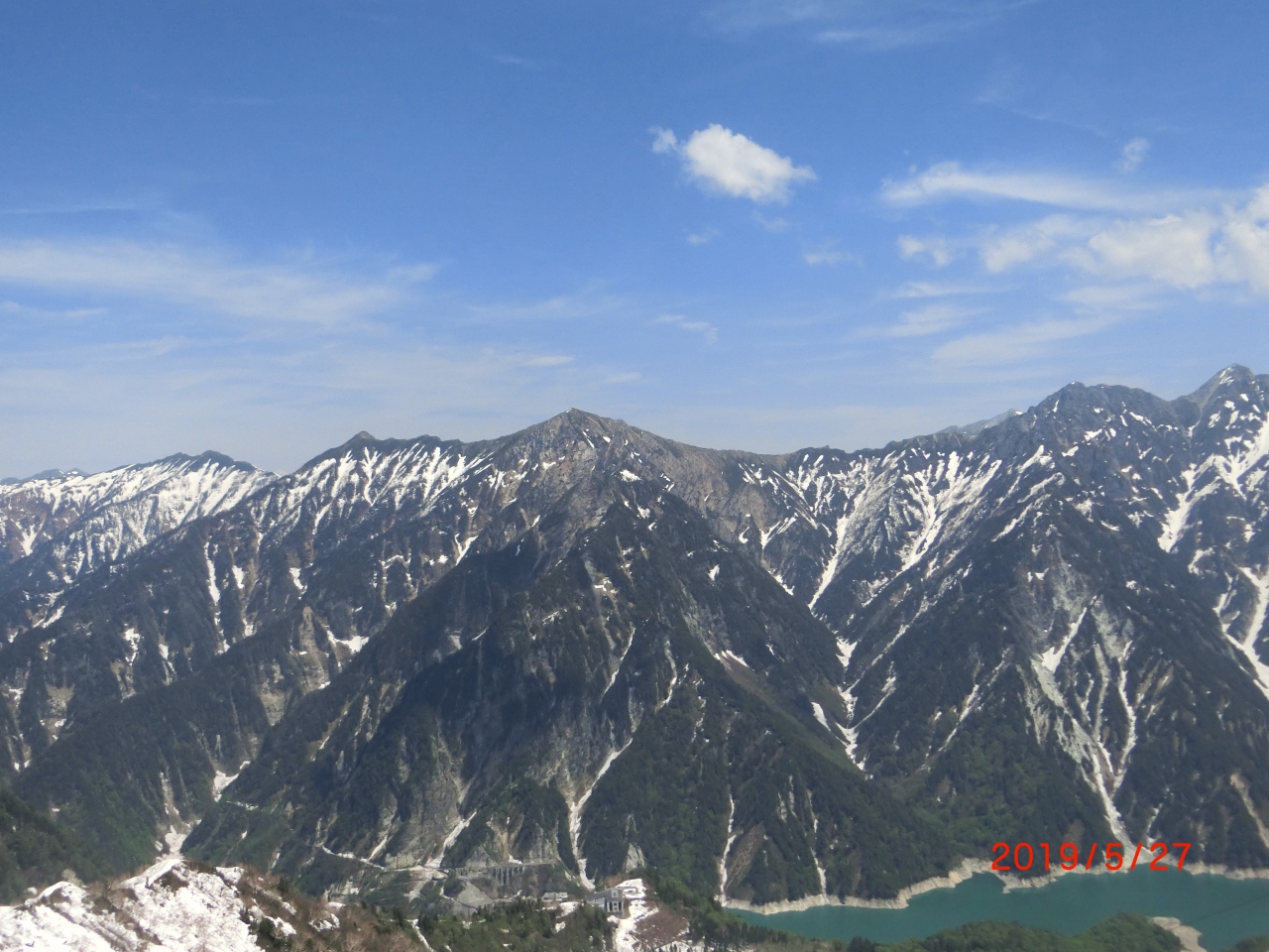 大観峰から展望したアルプスの山と黒部湖です。