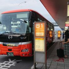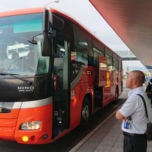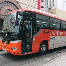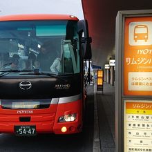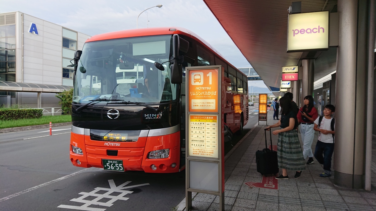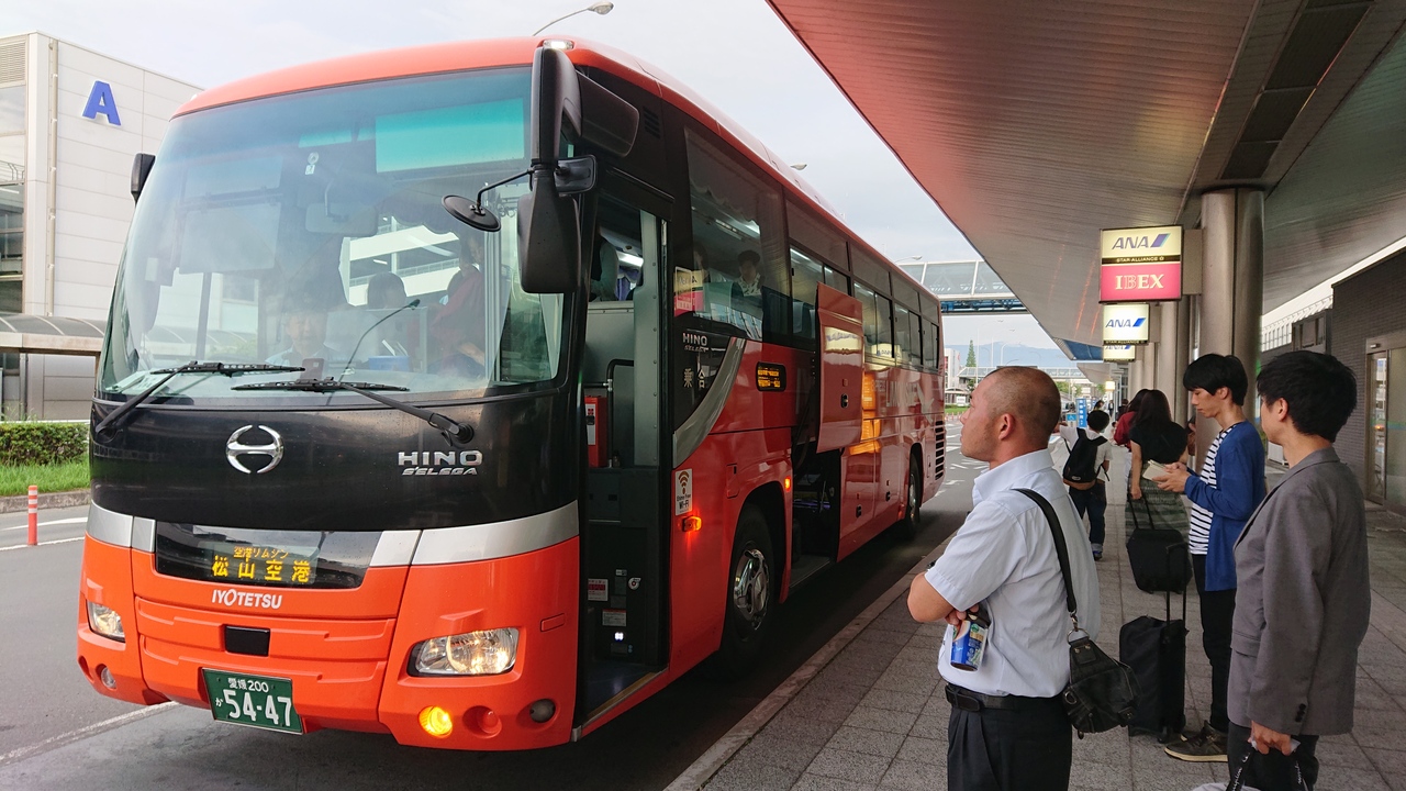 松山空港と市内を結ぶ伊予鉄道が運行するリムジンバス。平行して走る同じ伊予鉄バスの路線バスよりも運賃は高いものの、松山市内までノンストップ、国内線のフライトにあわせて運行、スーツケースなどの置き場かある、速達性、観光型のバスを使用するので快適等の理由から断然有利。空港からJR松山駅まで15分、松山市駅まで24分、大街道まで30分、道後温泉まで40分と速達。往路(松山空港発)は、道後温泉行きと松山市駅行きと2系統で松山市駅までの停留所は同じ。松山空港をほぼ同時に出発。復路(松山空港行き)は3系統あり、道後温泉発は松山市駅を通らず、松山市駅発、JR松山駅発のそれぞれノンストップで空港まで結んでいます。以前は青いバスでしたが、現在は伊予鉄の市内電車、郊外電車、バスと共通のオレンジ色のバスで目立ちますが、松山観光港行きのリムジンバスと同じ車体(こちらのバスの側面には「ISHIZAKI」と船(石﨑汽船)がデザインされています)なので間違わないように注意。運賃は後払いです。