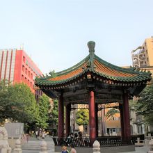横浜中華街のど真ん中にある公園です。一対の中国獅子像がありました。恐ろしい顔をしています。右側の獅子は玉を持ち、左側は何か生き物を抑えているように見えました。どんな意味かは分かりません。中国らしい会芳亭という屋根つきベンチがあって、多くの人が座ってスマホしていました。