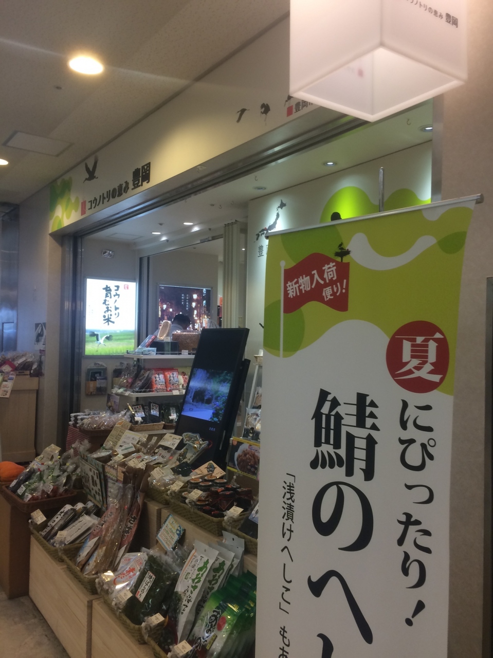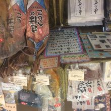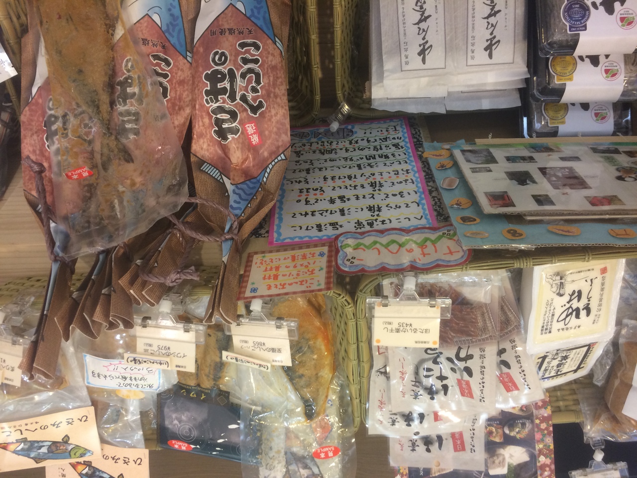 小さな店舗なので、品物がびっしりありましたが観光の情報はほとんどなく、物産館でした。店頭にはサバやほたるいか等の干物関連がたくさん置いてあり、ペットボトルに入った米まで販売していました。店内に入ると生もの系の品が置いてありました。
