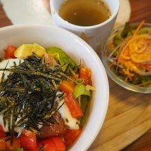 通常のロコモコは、ライスの上にハンバーグと目玉焼きをトッピングしているが、ポキロコモコは、その名の通り、ポキ(POKE。マグロ、タコ等のシーフードの醤油漬け)をトッピングしている。日本の料理っぽいが、アボカド・トマト・レタスもトッピングしている点は、ハワイ風。