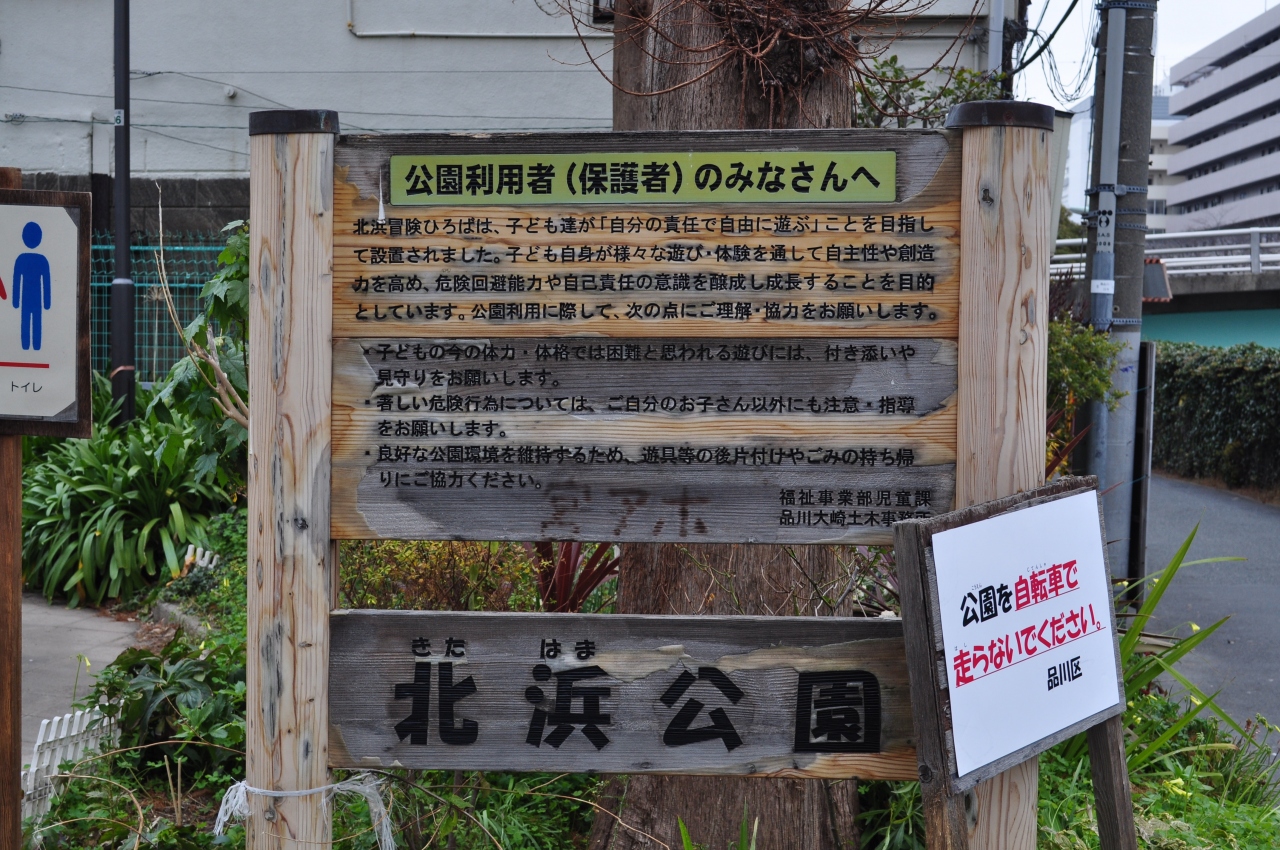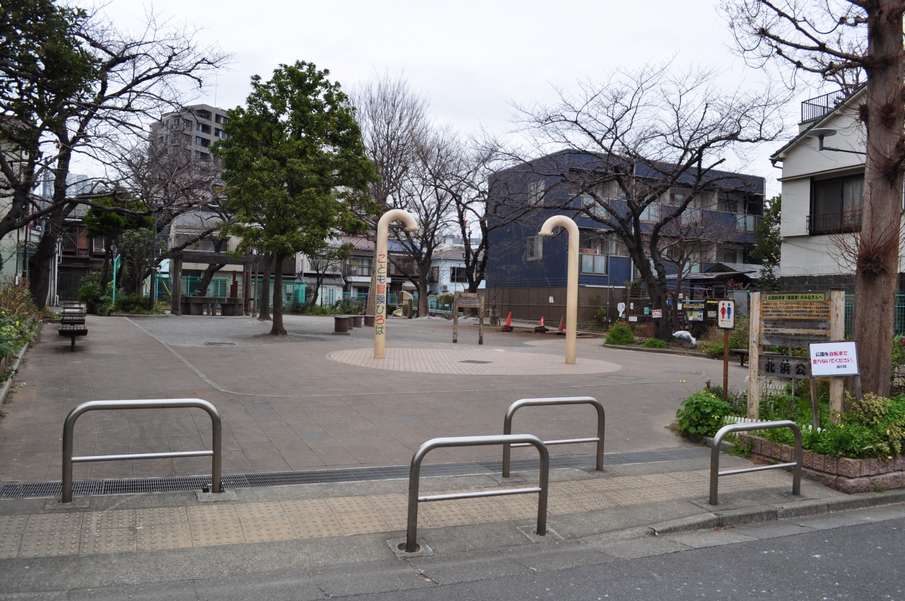 北浜公園は新馬場駅から徒歩7分ほど、目黒川沿いに歩いて荏原神社の先の品川橋を越えてすぐの場所にある公園になります。あまり特徴的な公園という訳ではなく、どこにでもある普通の公園といった感じでした。遊具や砂場の他、トイレや防災設備なども置かれていました。訪問した日は連休の初日の午前中でしたが、時折小雪がちらつく天候という事もあって、公園で遊んでいる人は誰もおらず寂しい感じがありましたが、天気の良い日なら多くの親子連れでにぎわいそうな公園だな、と思いました。品川周辺の史跡散策のついでに休憩する場所としても利用できる公園ですね。