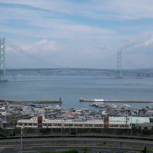 明石海峡大橋を淡路島側から見るなら神戸淡路鳴門自動車道の淡路サービスエリア。下り線のSAでは観覧車の近くから、明石海峡大橋を正面に全景を見られます。ここから見ると高さ約300m、長さ約4000mの橋が手に取る様に分かり、その大きさに驚かされます。