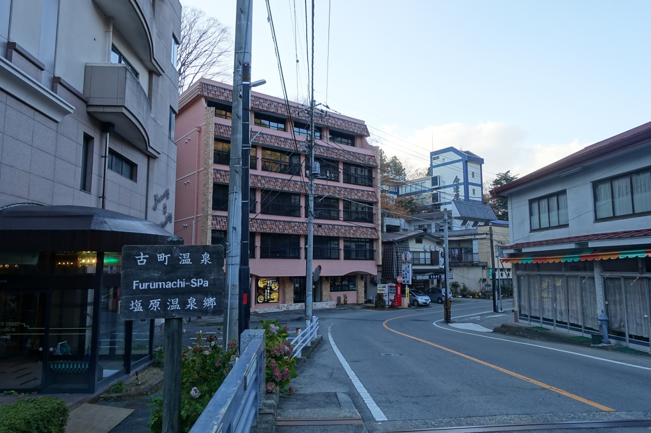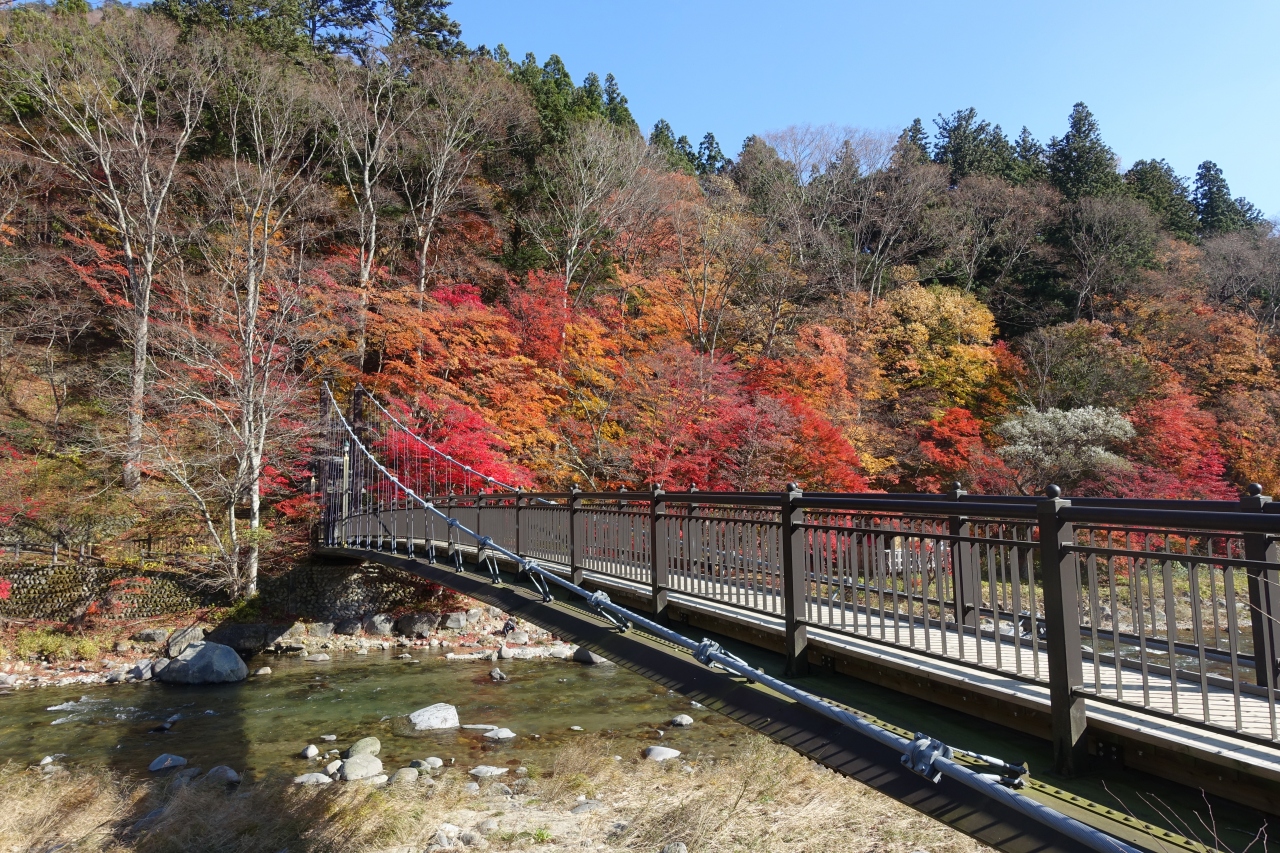 塩原十一湯の中では一番旅館や店が多く、街道沿いに温泉街を形成しています。妙雲寺の先の橋で箒川を渡ると「古町温泉」という看板が建っているので、門前と古町の境はこのあたりのようです。もの語り館の駐車場に車を停め、紅の吊橋周辺を散策。紅葉はやや散り始めになっていましたがそれでも葉が真っ赤になった木もまだあって、地面に落ちたモミジの絨毯も風情がありました。