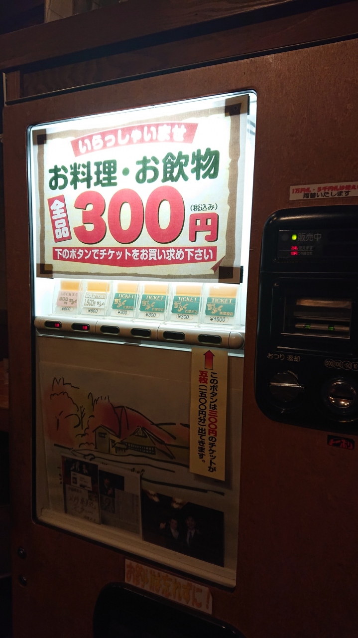 秋葉原駅から両国方面に大きな通りを少し入ったところにある、夜はお酒もおつまみもなんでも300円のお店。店内にある自動販売機で、チケットを購入して、カウンターで交換する仕組み。赤いチケットが出れば600円分、白いチケットが出ると1500円分交換できる。採算度外視と思うくらいおつまみの種類は豊富で、ボリュームもある。作りたて以外は、その場で温めてくれます。また、お酒の種類も豊富で飲み飽きない。軽く飲みたいとき、夕飯代わり、簡単な飲み会など、使い方も多様。