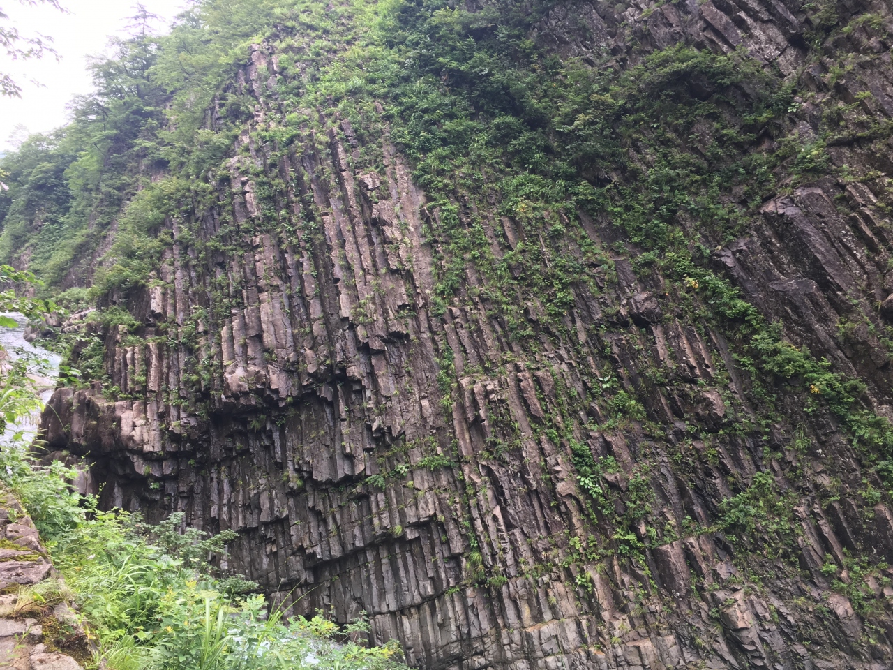 7月の3連休に訪問しましたが、確かに人気スポットのようで駐車するための車の行列ができていました。崖一面がすべて柱状節理になっており規模に驚かされました。トンネルの途中にある観察スポットから見ることができます。