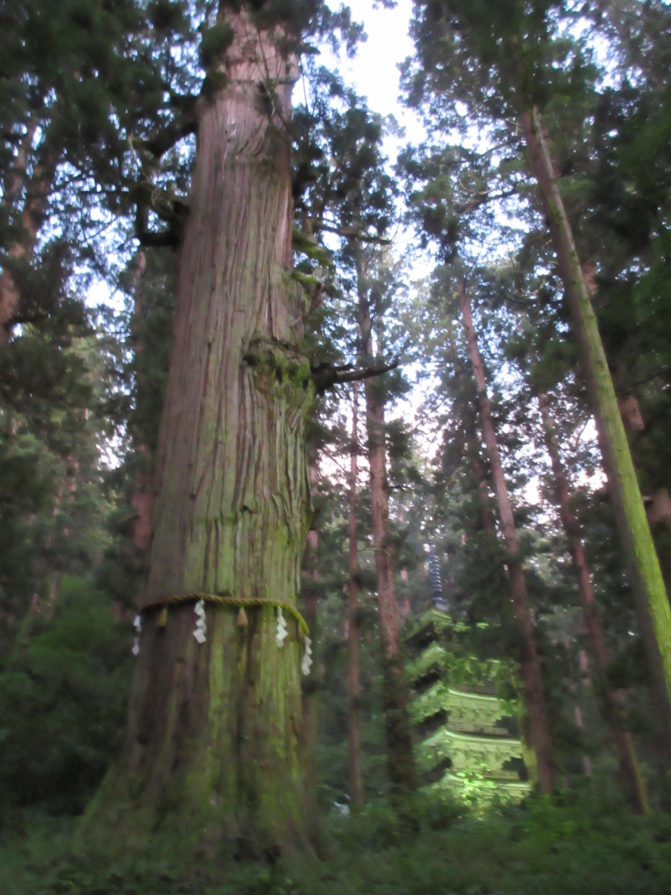 羽黒山五重塔の近くになります。JRのポスターになったので、多くの方はみたことのある風景だと思います。樹齢は1000年以上、根周り10.5m、幹周8.25mという巨木。かつては近くに婆スギがあったというが、明治35年に暴風に倒れたそう。同じような巨木だったと思うのだが、倒れるほどの暴風ってどれだけなのかと思った。
