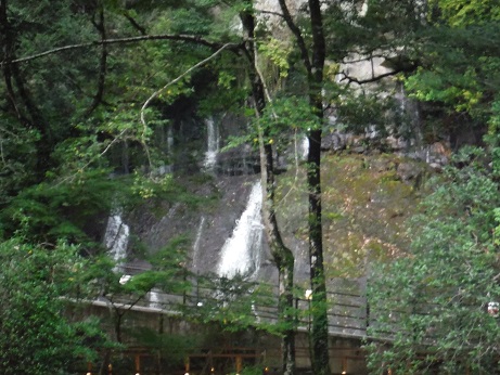 国道から高千穂峡へと下る道筋にあります。おのころ池の背後にそそり立つ断崖絶壁の途中から流れ落ちる湧水の滝で、柱状節理の層の境目から水が噴き出しています。玉垂の滝付近は御神域であり、町の水源地ともなっています。