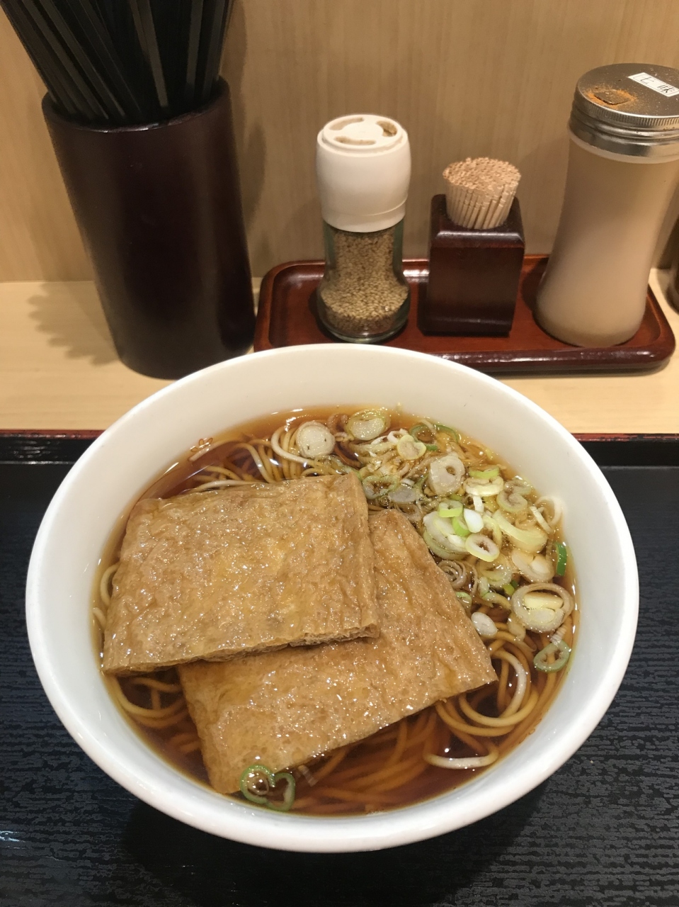 駅ナカに店舗を構える立ち食い蕎麦のいろり庵きらくさんです。ボリュームがある玉ねぎのかき揚げが乗っているかき揚げそばは暖かいのはもちろん、冷やしかき揚げそばもあります。きつねそばは甘く煮たお揚げが2枚入っています。