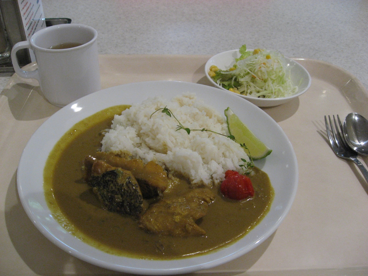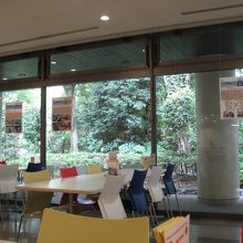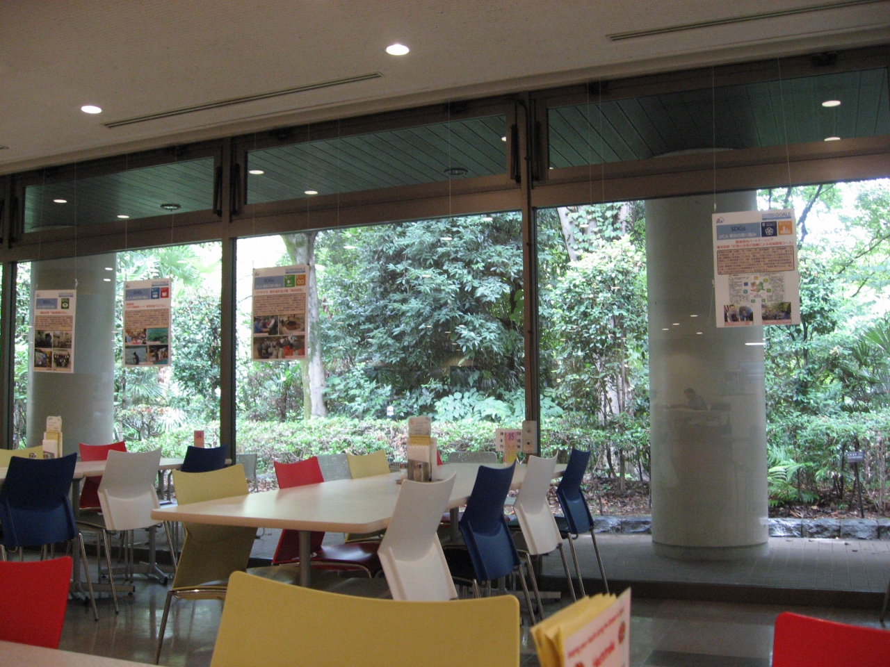入口で名前の記入をして食堂は地下といっても窓際の席は緑が見え、食堂の椅子もカラフルでおしゃれなカフェみたいです。
