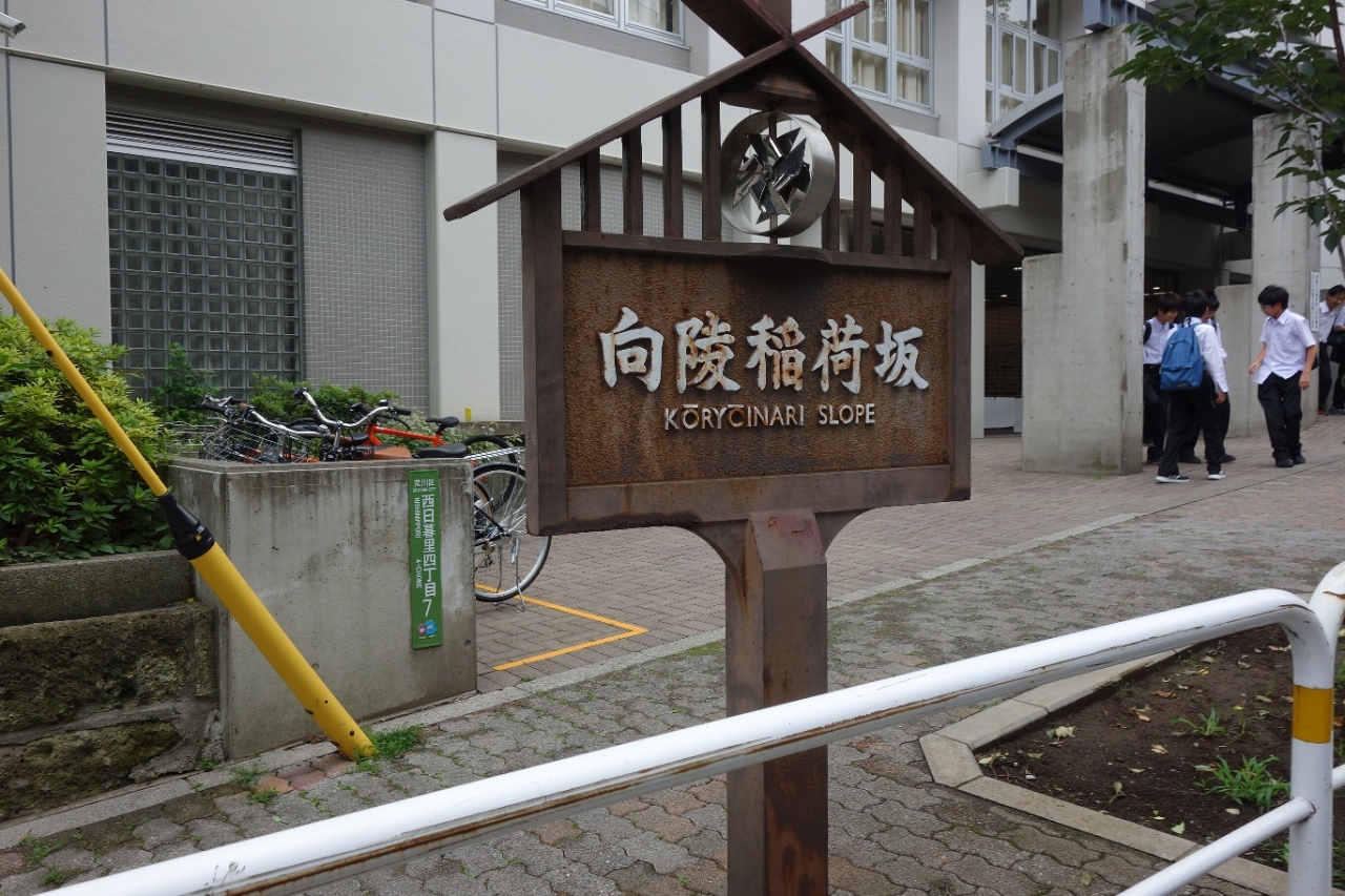 日暮里や西日暮里あたりのエリアを散策中こちらの坂道を通りました。西日暮里駅に近い有名進学校の横を坂道は上がっていきます。直角に折れた後更に上へと進んでいくと左側に坂名の由来になったと思われる向陵稲荷神社が有ります。