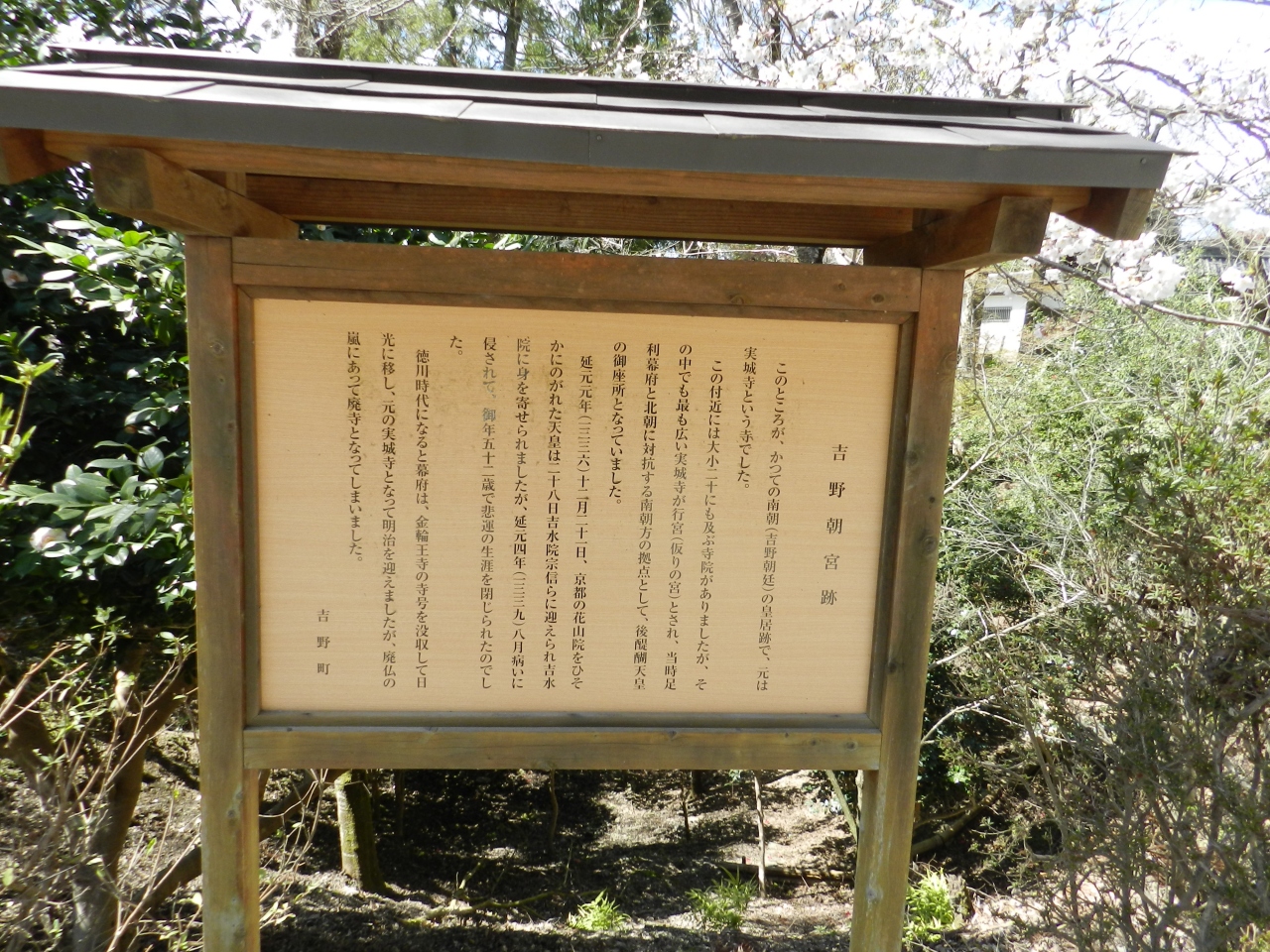 吉野山のシンボル金峰山寺蔵王堂の手前を右に行った所が悲運の南朝の宮跡。後醍醐天皇が今は亡き実城寺を皇居とされ此処で生涯を終えたそうです。3代続いた南朝で吉野山の有名遺跡となっています。実城寺は寺号を金輪王寺と改めましたが徳川時代、明治維新を経て廃仏毀釈で廃寺となり南朝皇居跡公園となっています。桜が素晴らしいです。