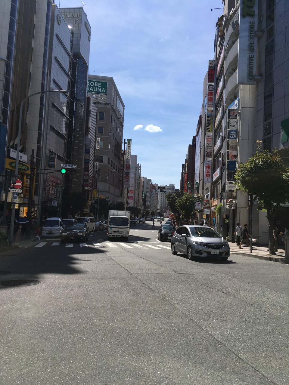 三宮地区の幹線道路のひとつ生田新道。同じ地区にあるいくたロードと名前も似ているので、間違いやすいのですが、横(東西)は生田新道、縦(南北)はいくたロードと覚えておくと便利。この道も飲食店やホテルが多いので、観光では絶対に使う場所。車道にくらべると歩道はちょっと狭いのであるきにくいです。