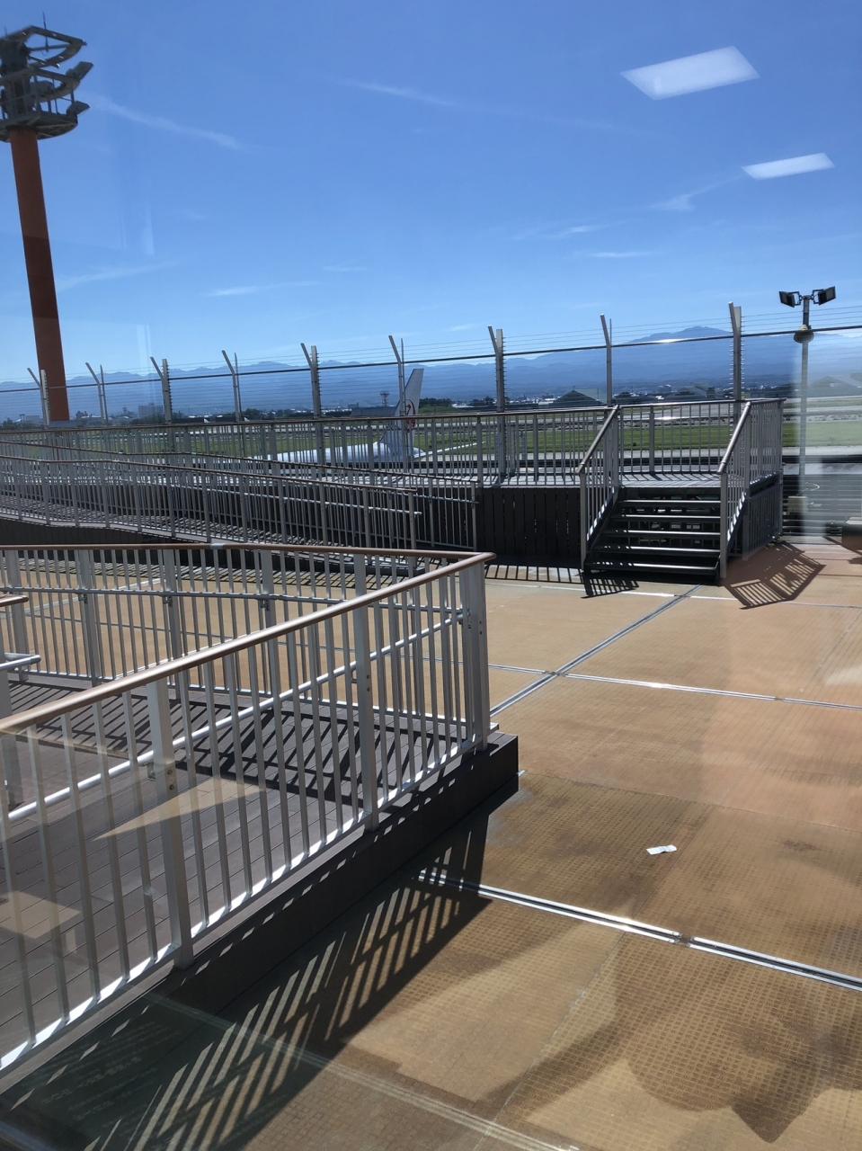 二階搭乗検査の場所の右側に展望台に上がる階段があります。エレベーターは見当たりませんでした。上がると子供が遊ぶスペースがあり展望台につながっています。小松空港は自衛隊との共用空港なんで自衛隊の飛行機も見ることができますよ。