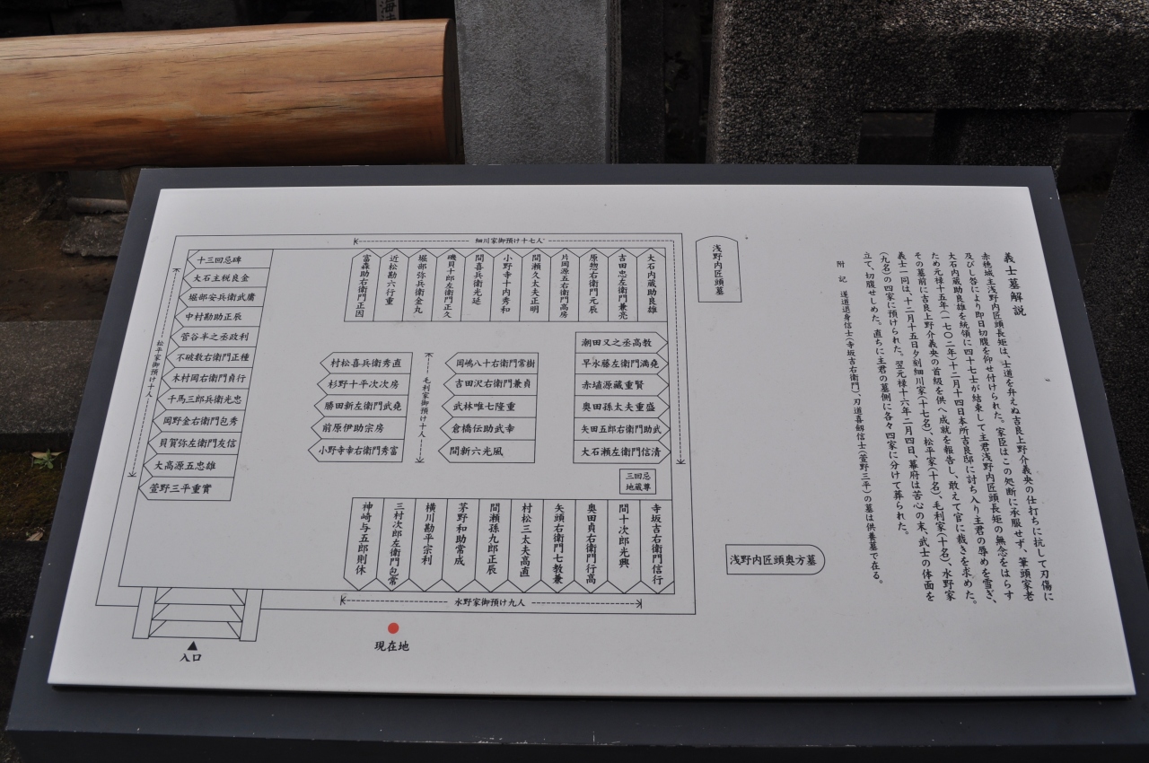 四十七士墓所は京浜急行泉岳寺駅を降りて徒歩5分ほど、泉岳寺の境内にあります。こちらは江戸時代中期に、赤穂事件(忠臣蔵)で吉良邸に討ち入りをして自害することとなった四十七士のお墓と、主君浅野内匠頭のお墓になります。主君のかたき討ちというのは日本人にとって美談とされたのでしょう、当時は助命を求める意見も多くあったそうですが、法は曲げられないとの理由で自害するお達しが下ったそうです。現在でもこのことを題材に扱った「忠臣蔵」は人気があり、泉岳寺四十七士墓所には四十七士を弔う方たちが訪れていました。とても悲しい気持ちになる場所ですね。一方的に美談にするつもりはありませんが、主君を思いこのような事件を起こさなければならなくなった四十七士の墓前に手を合わせさせていただきました。