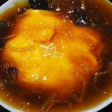 丼にライスをたっぷりと盛り、玉子で被せ、玉ねぎ・木耳等の野菜を含んだ餡を回し掛けている。