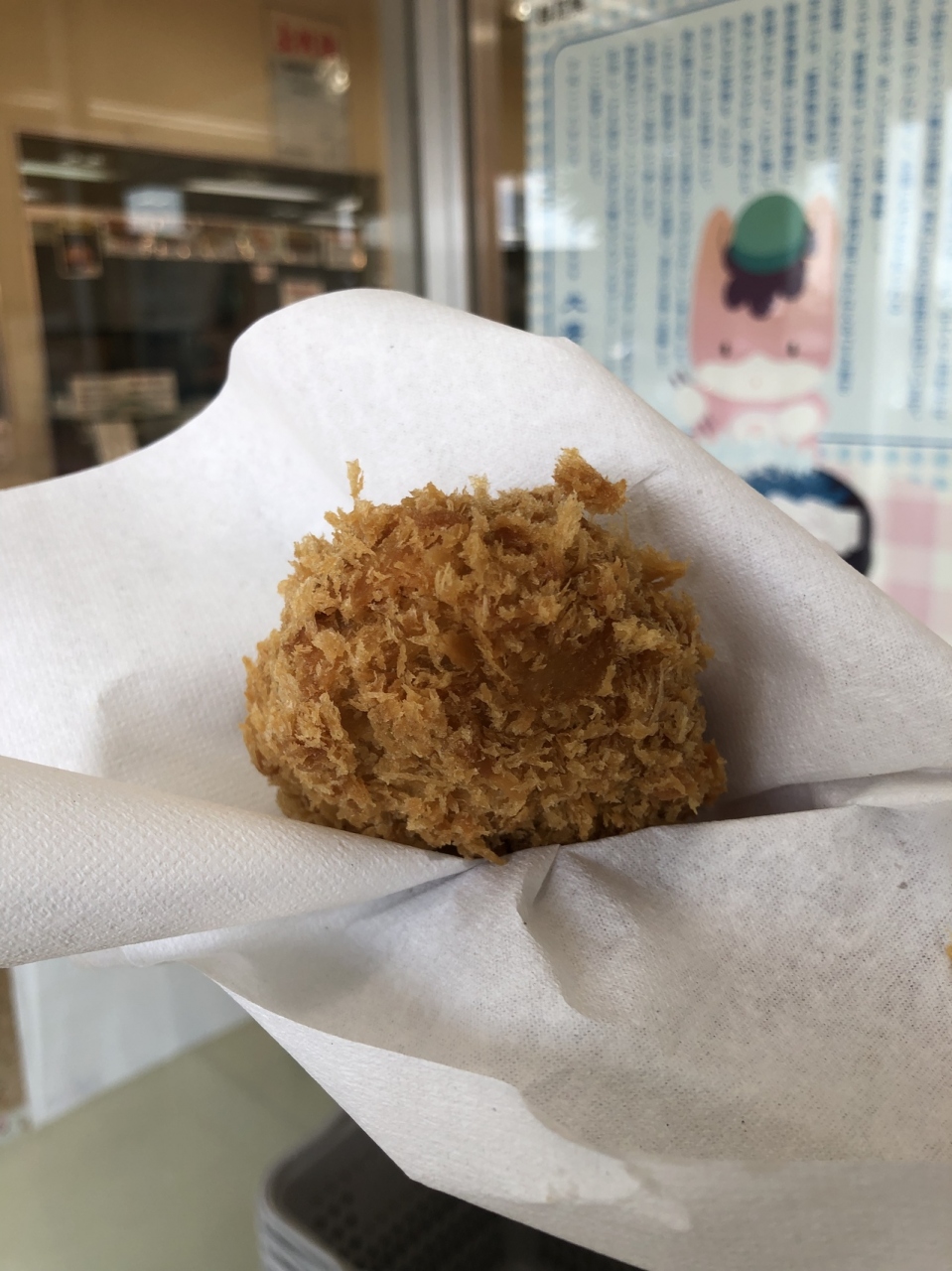 ららん藤岡内にある肉の駅。この日もゴルフの帰りに、こちらの揚げたてコロッケを楽しみにしていたので、そのコロッケを頂きました、衣がサクサクで中もぎっしりで、やはりおいしいですね。で、このコロッケ、ソースいらずです。家用にベーコンも購入して、満足でした。