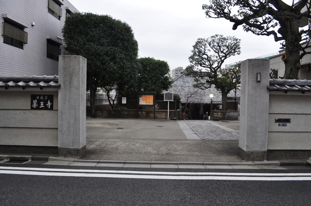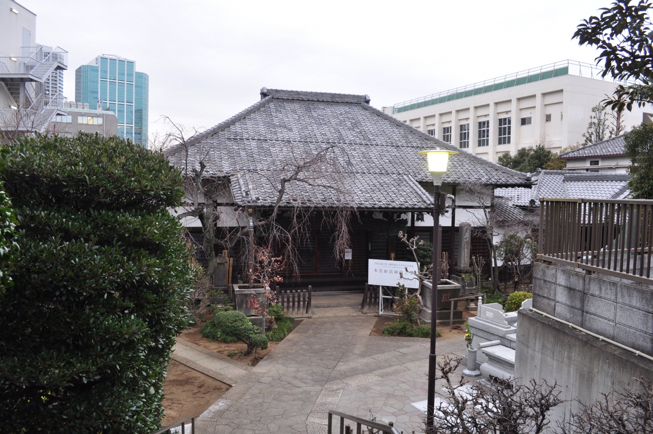 薬王寺は泉岳寺駅から徒歩10分程、泉岳寺駅の西側の高台、港区立御田小学校の近くにある日蓮宗の寺院になります。元和7年(1621年)に麻布に創建、その後1624年に現在の場所に移転したそうですが、たった3年しか最初の場所にはなかったんですね。ちょっと衝撃的でした。門をくぐると階段で下りるような地形となっており、その先に本堂があります。本堂の手前にはしだれ桜と思われる木もあり、桜の季節に再度来てみたいと思いました。