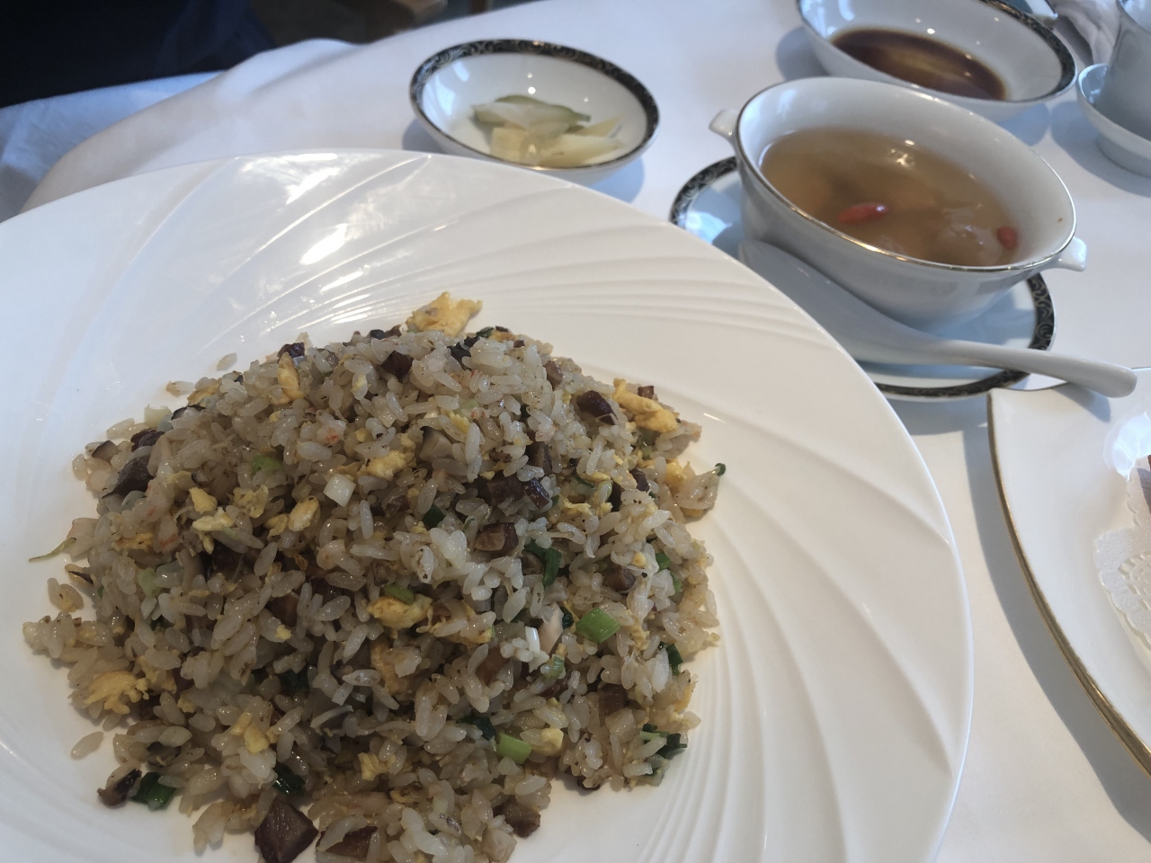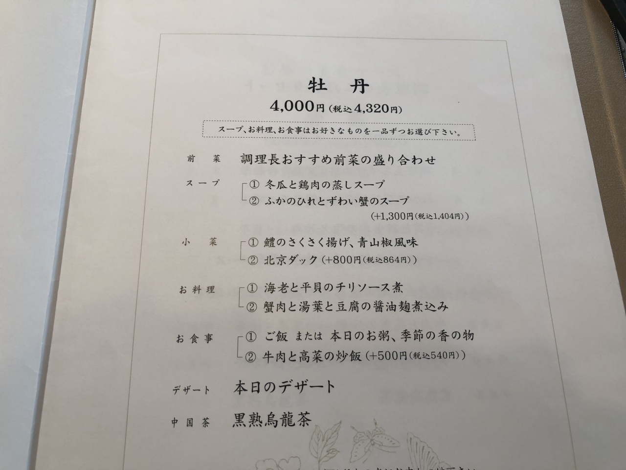テレビで中国人ガイドが「こんなに美味しい中華は食べたことがない」と言っているのを聞いて、娘とランチに行きました。コースは3000円からあります。私は4000円のコース、ふかひれスープ、エビチリ、北京ダックをオーダー。娘はチャーハンと春巻きを頼み、シェア。娘の方のが口に合いました。
