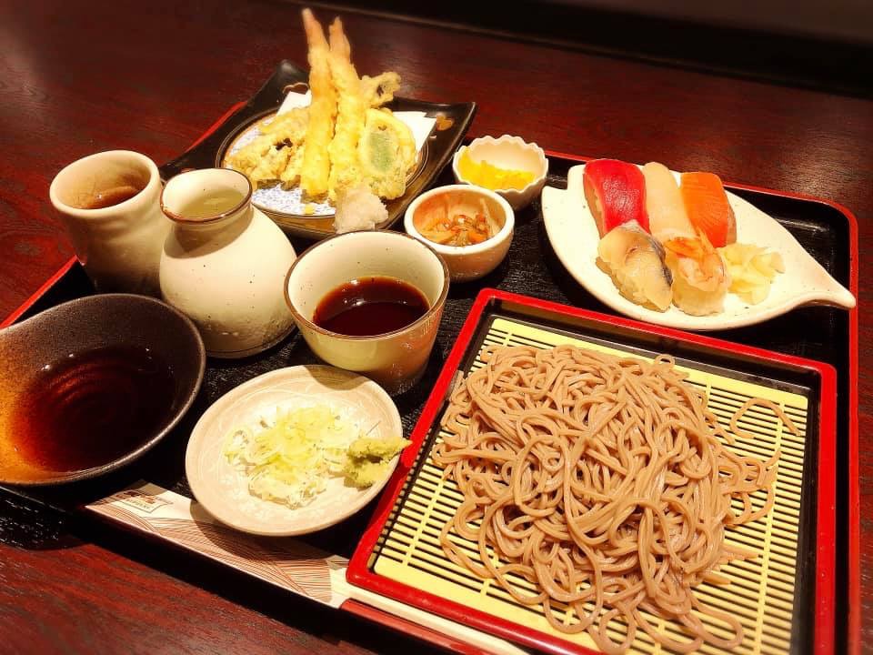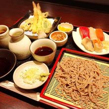 今回は、三種和定食(天婦羅・寿司・蕎麦)を注文。