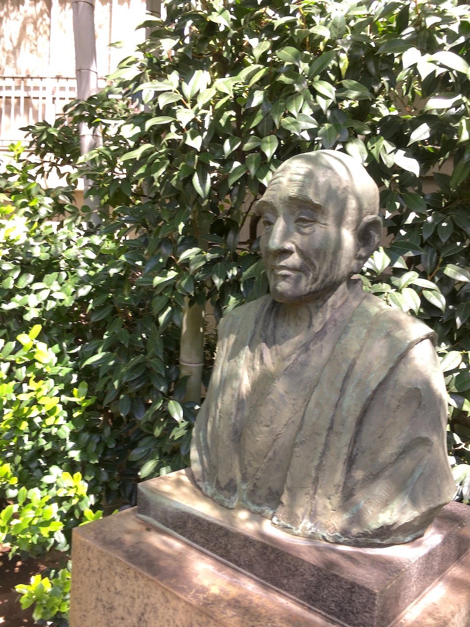 お寺の境内に葛飾北斎のお墓があり、他にも北斎ゆかりの銅像や石碑があります。