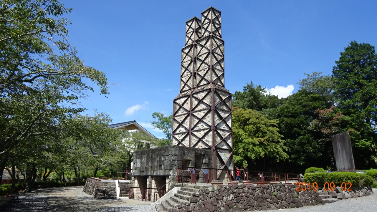 反射炉の前の茶畑の登ると小さな展望台があり、富士山と反射炉の両方が見えます。