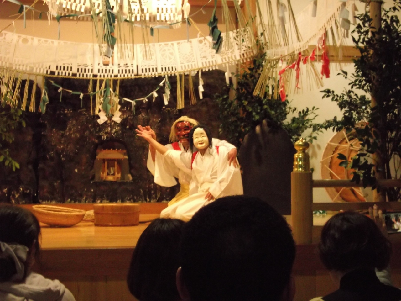 高千穂神社の境内にあり、毎日午後8時から観光用の夜神楽が行われるところです。冬季に高千穂の各神社で行われる夜神楽は日にちが合わないと見られませんが、ここでは全部の演目の中の主要な4演目を見ることができます。雰囲気のある神楽殿の中で、高千穂の神話の世界にどっぷりと浸かれます。