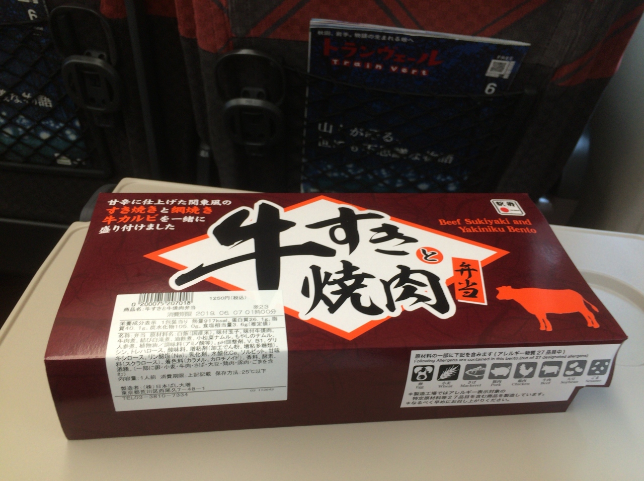 ホーム上にあるので出発間際でも買えますが、係員の手際は悪くはないとはいえ、店内で選んでからもレジ待ちで待ったので時間に余裕を持っておくにこしたことはありません。1,250円の牛すきと焼肉のお弁当を注文し車内へ。値段はそこそこしますが、中の牛肉がご飯とマッチして非常に美味しかったです。