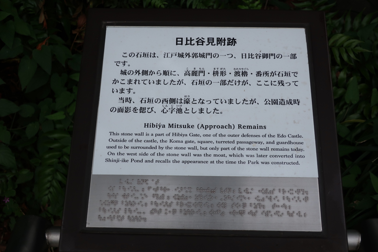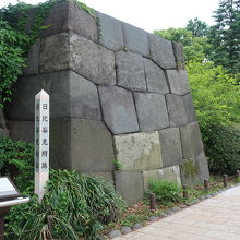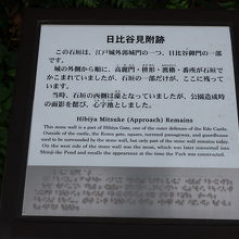 日比谷公園の北東部入口を入って30m程の所に石垣があります。この石垣が日比谷見附跡です。見附とは城の外郭部に作られた砦的な門で、日比谷見附には高麗門、枡形、渡櫓、番所があったそうですが、現在残る石垣は片側の一部しか残っていないのが残念です。しかし、赤坂見附や牛込見附の様に街中ではないので、じっくりと見学できるところが城好きには嬉しいです。