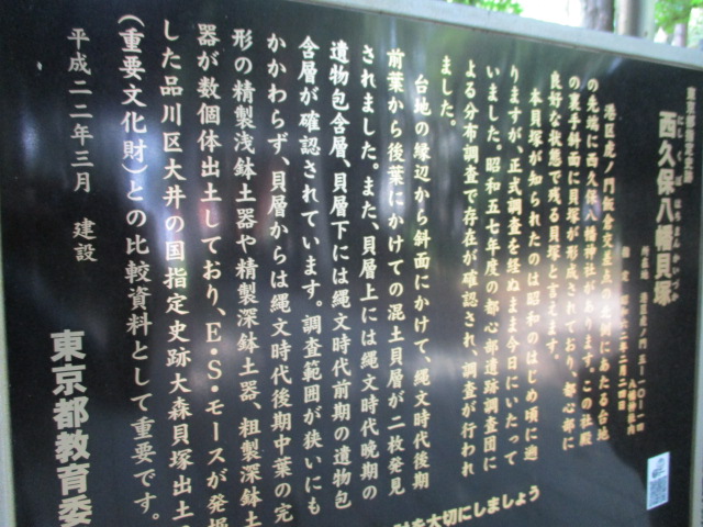 東京メトロ日比谷線神谷町駅2出口から桜田通りを板倉方面に約150mほど先にある西久保八幡神社貝塚に歩いて5分ぐらいで着きます。西久保八幡神社貝塚はコンクリート鳥居をくぐり急な階段約40段を上ると静寂な雰囲気の境内の手水舎横に案内板があり神社の裏側に貝塚があると記されてます。縄文時代はこの辺りは海辺で高台に人が住んでたと思うと不思議なロマンを感じがしました。貝塚を見れなかったのが残念です。