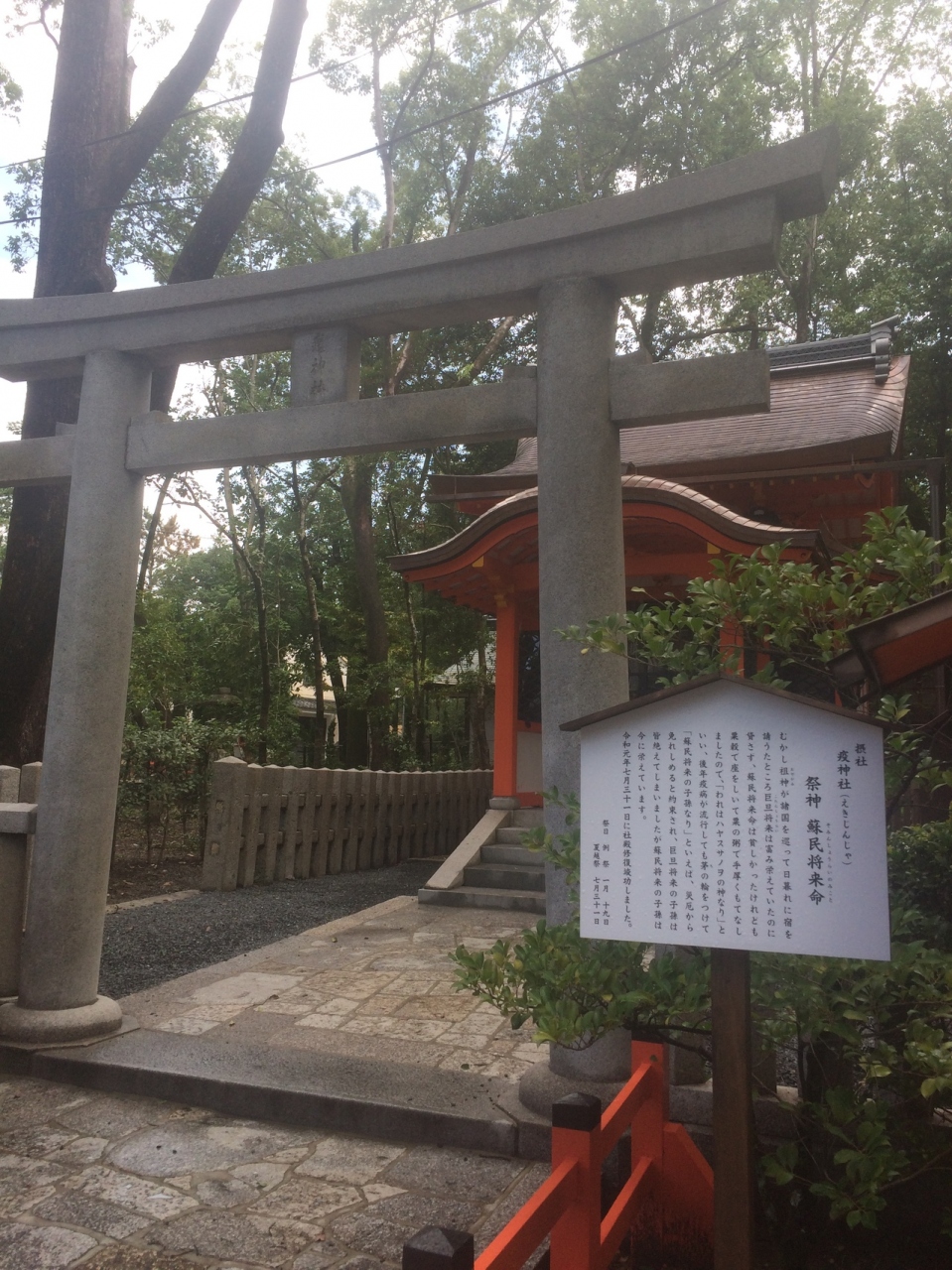 西楼門を潜り右側に行くとあり、隣にも同じ形をした太田社と言う神社がありました。グレーの鳥居をくぐると赤い社殿で、こじんまりしています。社殿の前には階段がほんの僅か5段ほどありました。八坂神社の本殿の大きさに対し小さいかわいい神社でした。