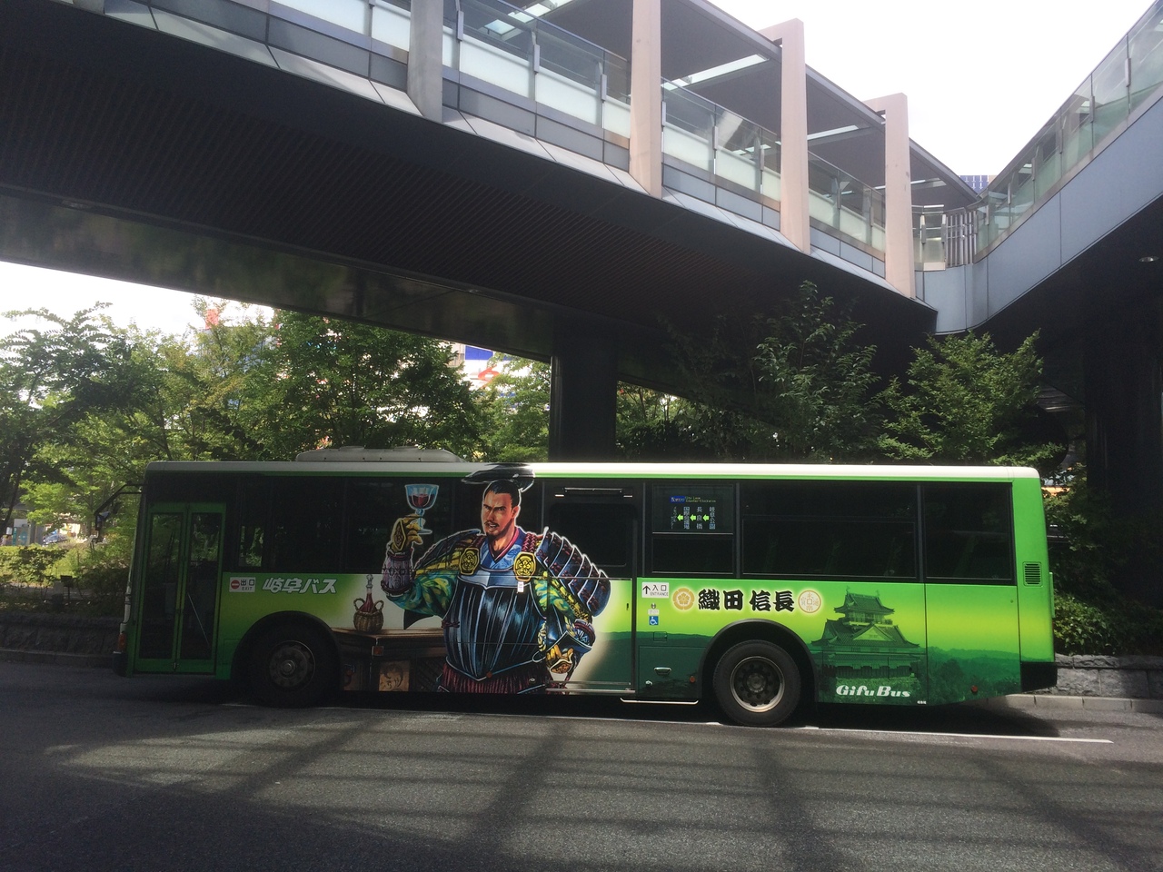 岐阜バスにド派手な絵がかかれ織田信長の絵でしたがマンガぽい絵柄で、戦国武将の格好をして、右手にワイングラスを持っていました。バスと絵柄はミスマッチな感じでたが目立つ絵柄でした。後方には岐阜城が描かれています。