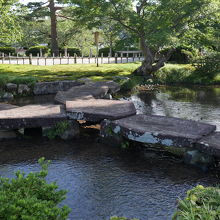 霞ケ池の近くにある、11枚の赤戸室石を並べて作られた橋です。雁の群れをかたどっているためこの名になったそうです。赤戸室石は柔らかくてすり減りやすいため、この橋もかなりすり減ってしまったそう。そのため残念ながら現在は人が歩くことはできなくなっています。が、渡れなくても曲水にかかる橋の姿に趣を感じられる場所です。