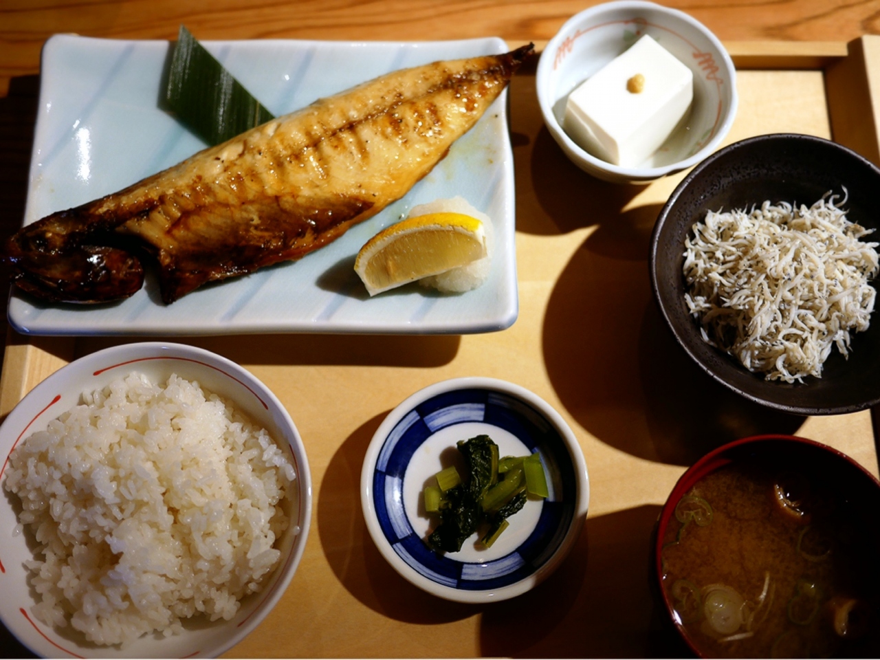 メインの鯖塩焼きに、ご飯、漬物、しらす(食べ放題)、冷奴、みそ汁が付きます。